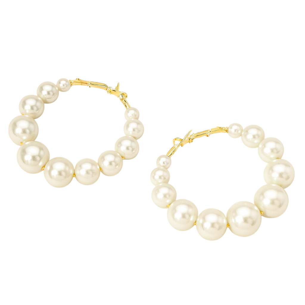 Details • Size : 2.25" X 2.25" • Omega Closure • Elevate your accessories with these bold faux pearl beaded hoop earrings featuring a playful arrangement of glossy round beads. The vibrant and dynamic design adds a fun and lively touch to your outfit, making them perfect for festivals, casual wear, or standout fashion statements. • Lead and Nickel Compliant