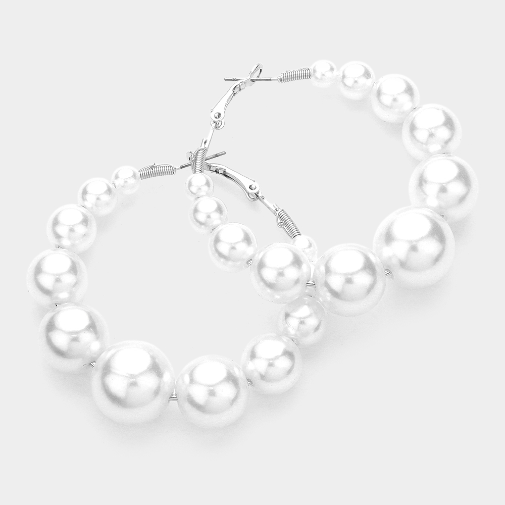 Details • Size : 2.25" X 2.25" • Omega Closure • Elevate your accessories with these bold beaded faux pearl hoop earrings featuring a playful arrangement of glossy round beads. The vibrant and dynamic design adds a fun and lively touch to your outfit, making them perfect for festivals, casual wear, or standout fashion statements. • Lead and Nickel Compliant