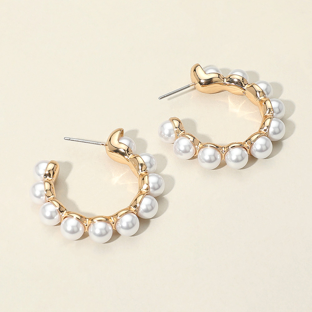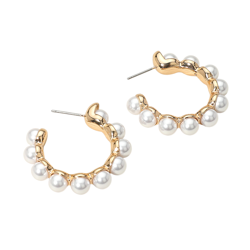 Details • Size : 1.3" X 1.3" X 0.25" • Post Back • Elevate your accessory game with these uniquely sculpted hoop earrings featuring luminous pearl-like details. Their dynamic shape adds a touch of artistic flair, while the elegant design ensures versatility for both everyday style and special occasions. • Lead and Nickel Compliant