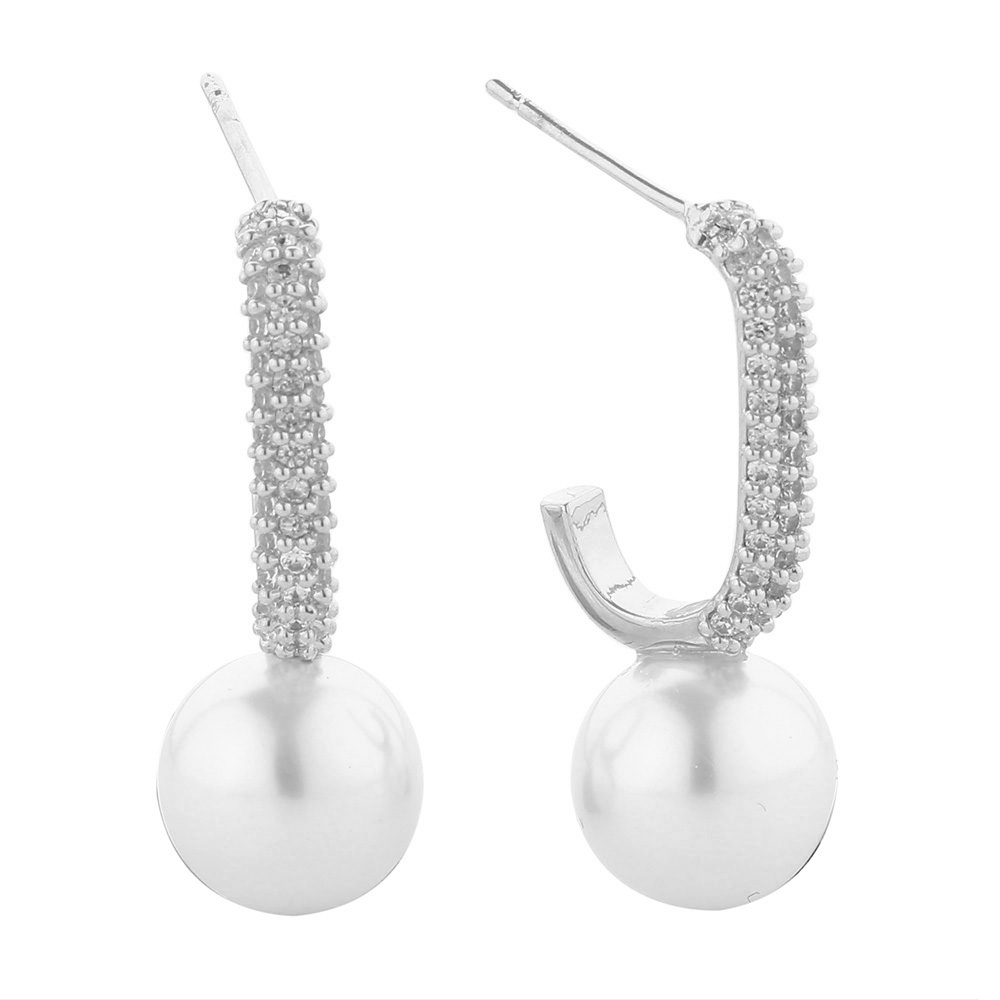 • Chic pearl drop earrings enhanced with a pavĂ©-accented hoop for a refined sparkle. Perfect for special occasions or elevating everyday looks, these earrings bring timeless beauty and a touch of glamour to any jewelry collection.