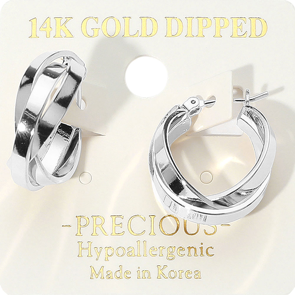 Details • Size : 0.8" X 0.8" • Pin Catch • Elevate your look with these twisted hoop earrings featuring a modern intertwined design. Perfect for everyday wear or special occasions, they bring a chic and versatile touch to any outfit while complementing your jewelry collection with effortless elegance. • Lead and Nickel Compliant • Hypoallergenic • Made In Korea • Gold Dipped