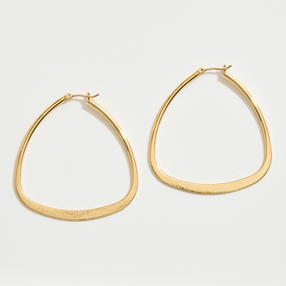 Details • Size : 2" X 2" • Pin Catch • Elevate your everyday look with these geometric triangle hoop earrings, designed with a sleek open silhouette that blends minimalism and edge. Their clean, contemporary lines make them a versatile statement piece for modern style that transitions from day to night with ease. • Brass • Gold Dipped • Hypoallergenic • Lead and Nickel Compliant • Made In Korea