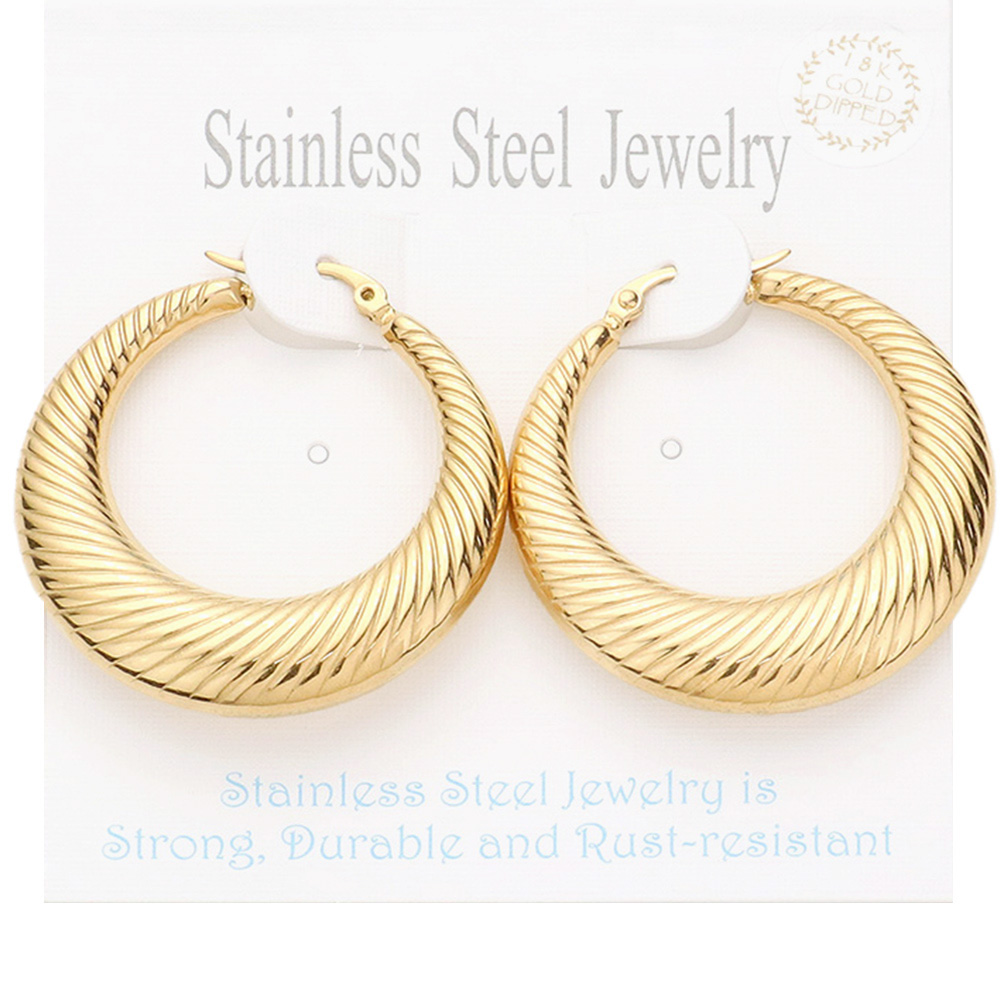 18K Gold Dipped Stainless Steel Textured Hoop Pin Catch Earrings