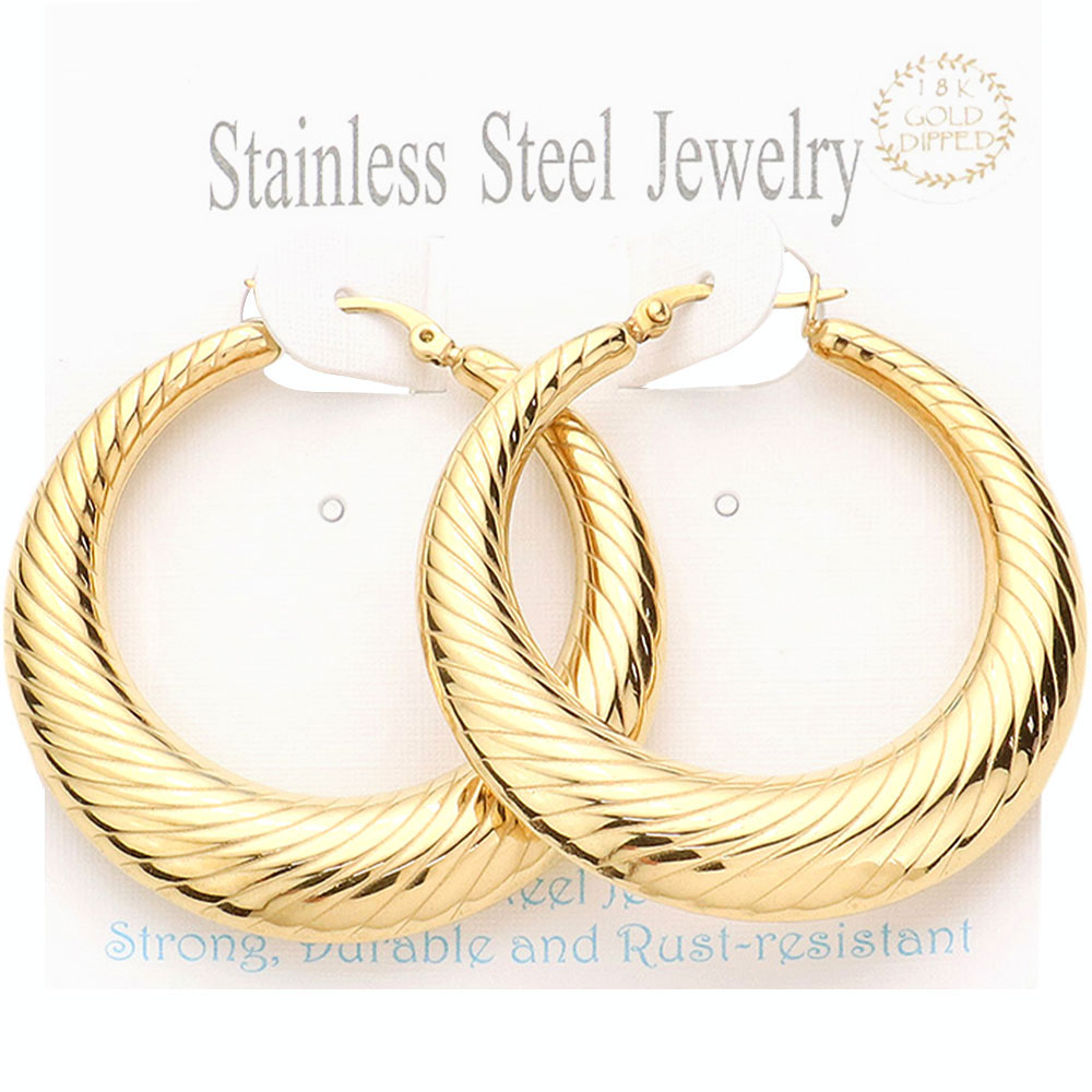 18K Gold Dipped Stainless Steel Textured Hoop Pin Catch Earrings