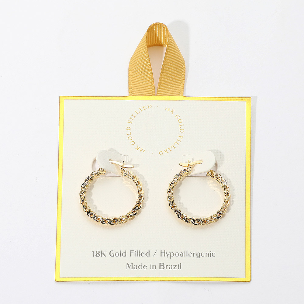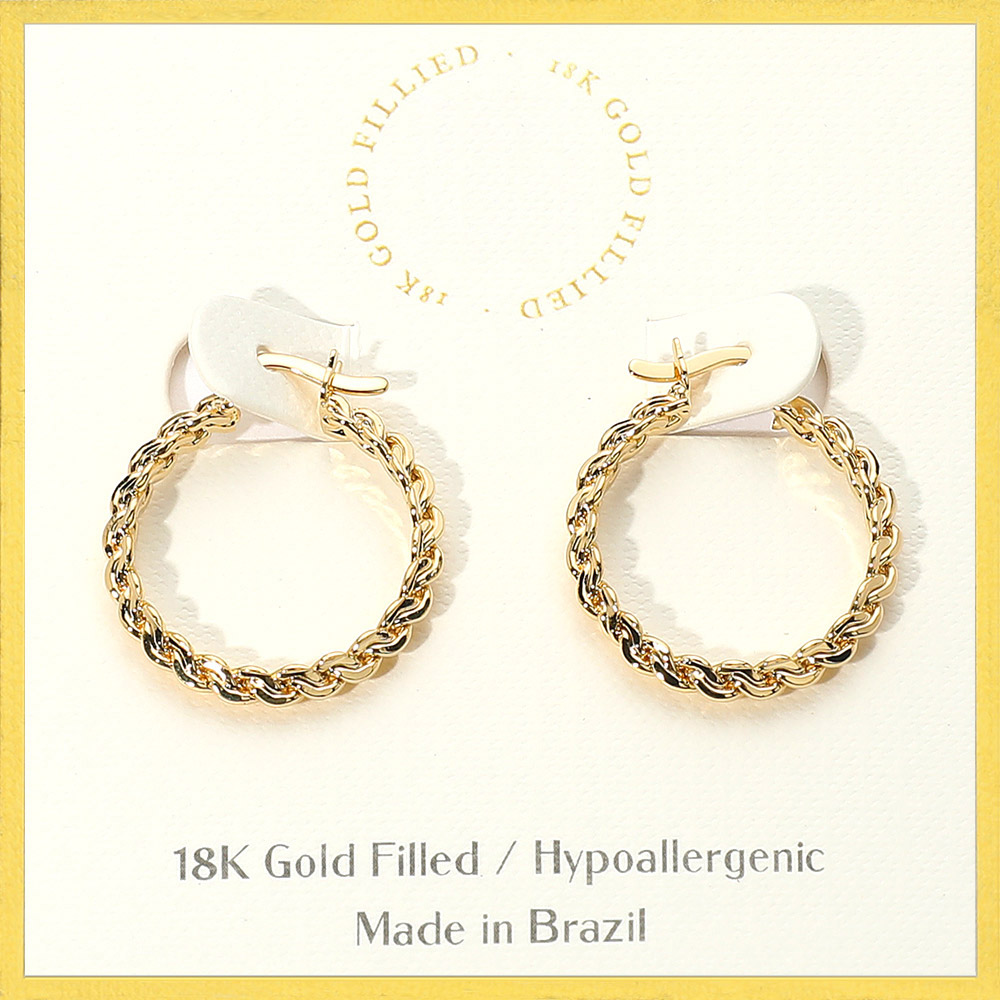 Details • Size : 1" X 1.1" • Pin Catch • Elegant braided hoop earrings crafted with 18K gold filled material. Hypoallergenic and made in Brazil, these lightweight hoops offer timeless style and all-day comfort for any occasion. Perfect for everyday wear or special events. • Lead and Nickel Compliant • Hypoallergenic • Gold Filled • Made In Brazil