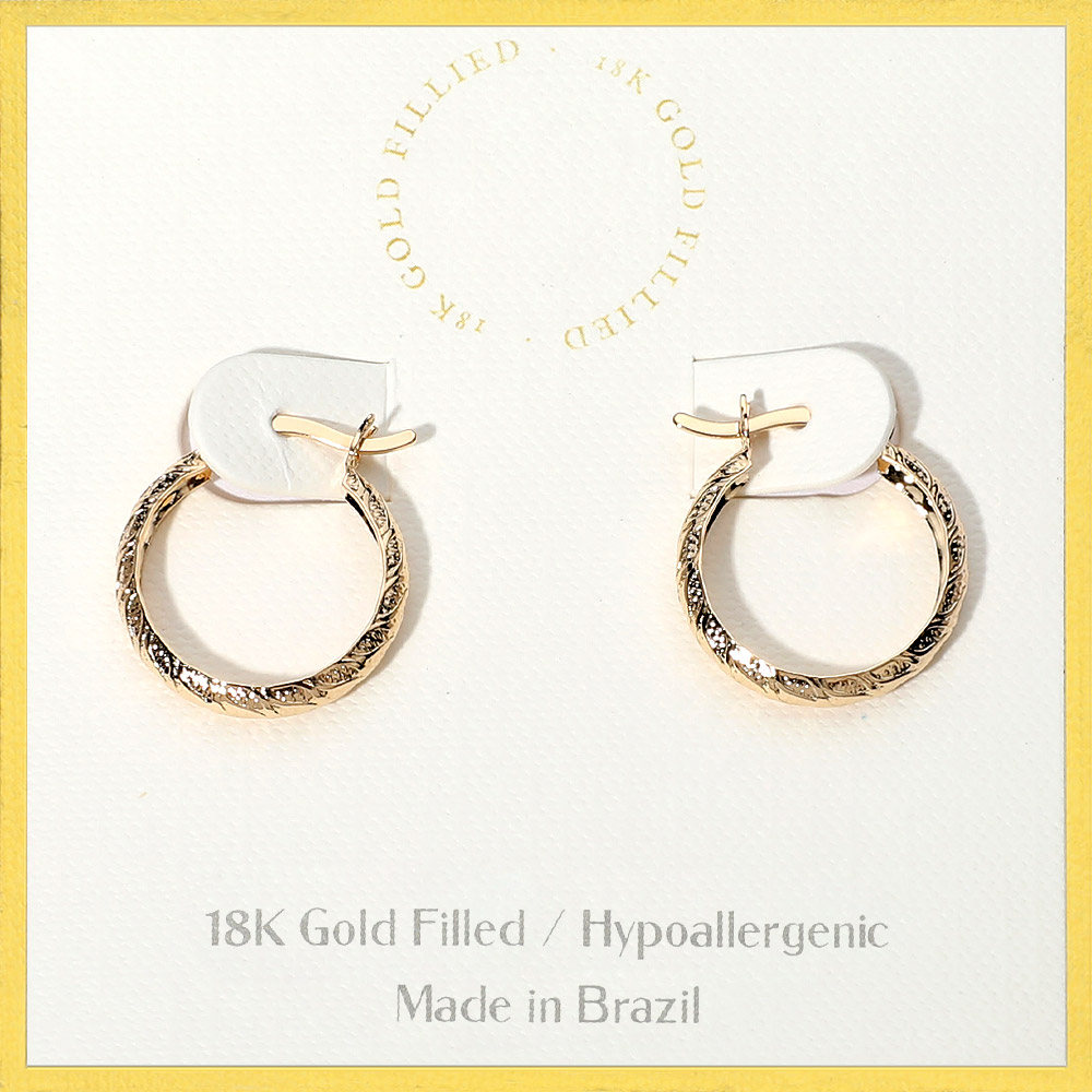 Details • Size : 0.75" X 0.8" • Pin Catch • Add a touch of elegance with these 18K gold filled textured hoop earrings, carefully crafted in Brazil. Designed with a hypoallergenic finish, they offer lasting comfort and style. Their subtle detailing makes them a timeless accessory for both casual and sophisticated looks. • Hypoallergenic • Gold Filled • Made In Brazil