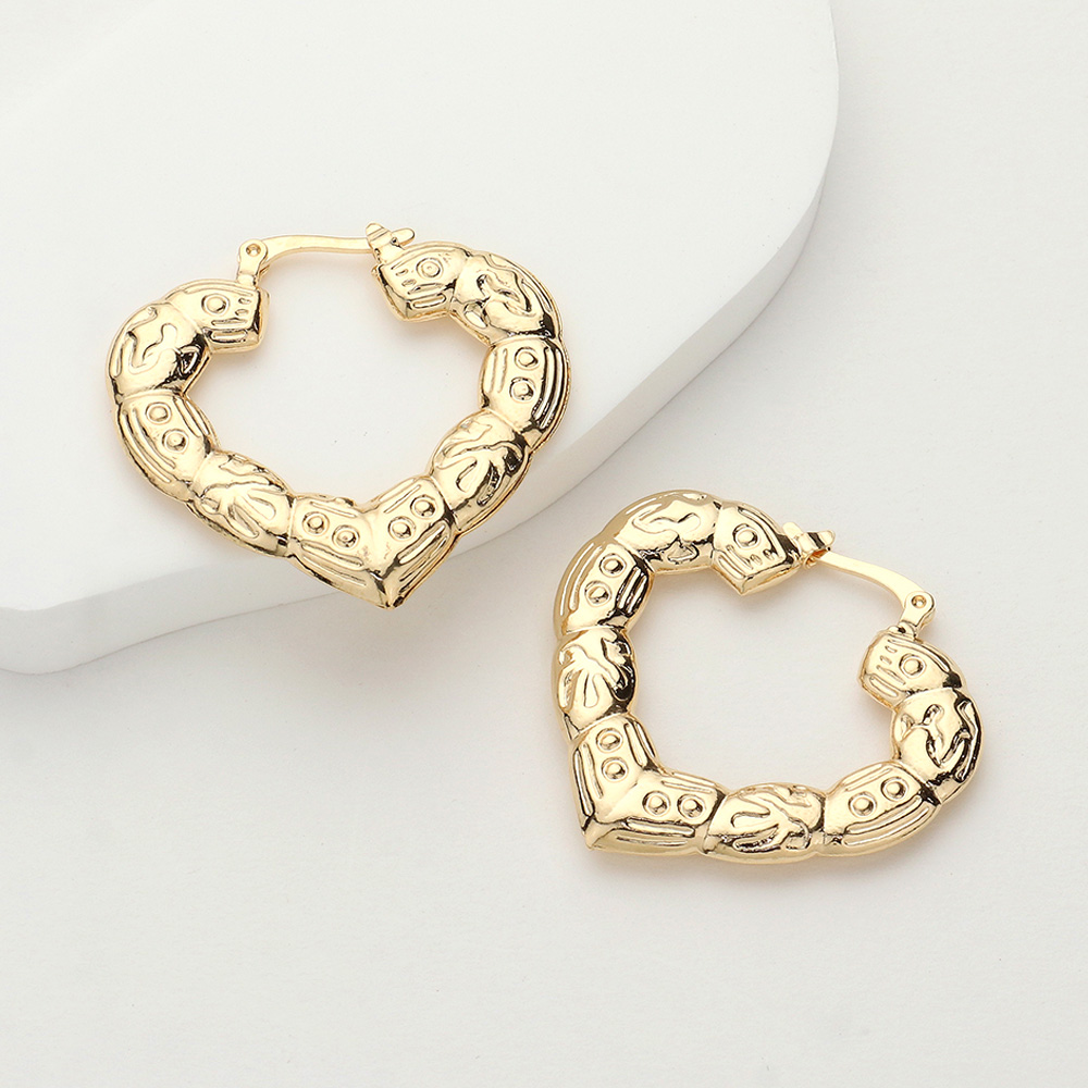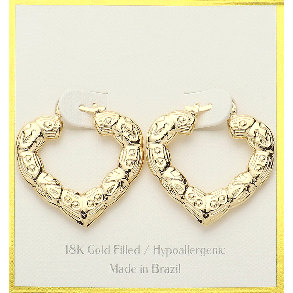 Details • Size : 1.3" X 1.3" • Pin Catch • These heart-shaped hoop earrings feature intricate embossed detailing for a romantic and bold look. Their sculptural design and polished finish add a touch of sophistication to any outfit. A perfect statement accessory for everyday elegance or special occasions. • Lead and Nickel Compliant • Hypoallergenic • Gold Filled • Made In Brazil