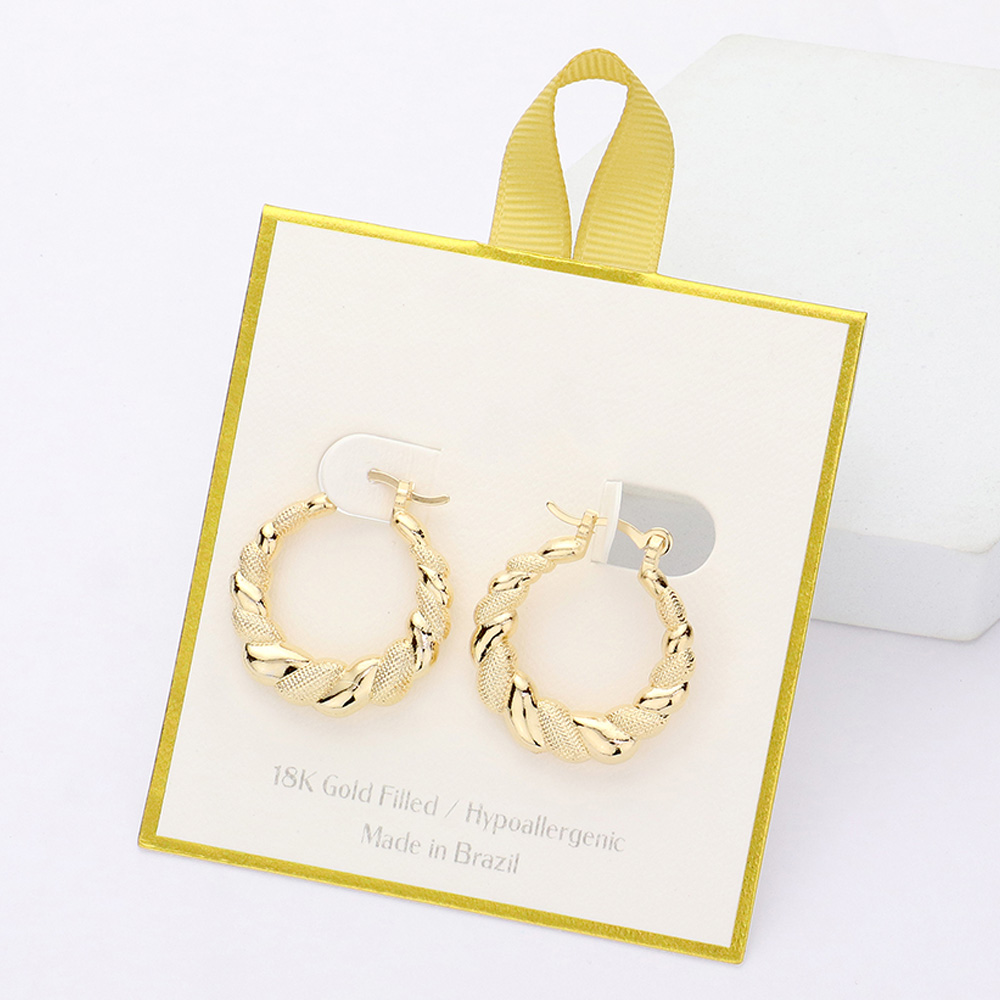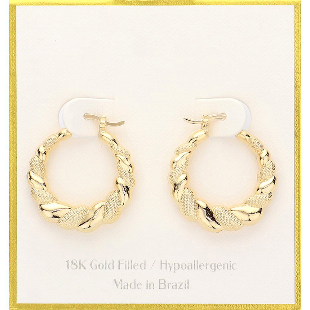 Details • Size : 1" X 1.2" • Pin Catch • Stylish hoop earrings with a bold twisted design and eye-catching texture. Ideal for adding a sophisticated flair to both casual and formal looks. Lightweight and comfortable for all-day wear. • Hypoallergenic • Gold Filled • Made In Brazil