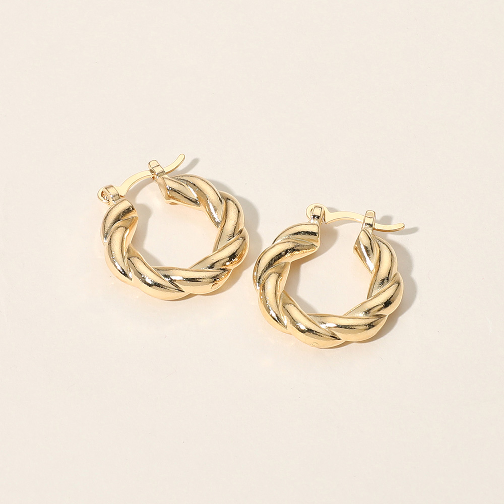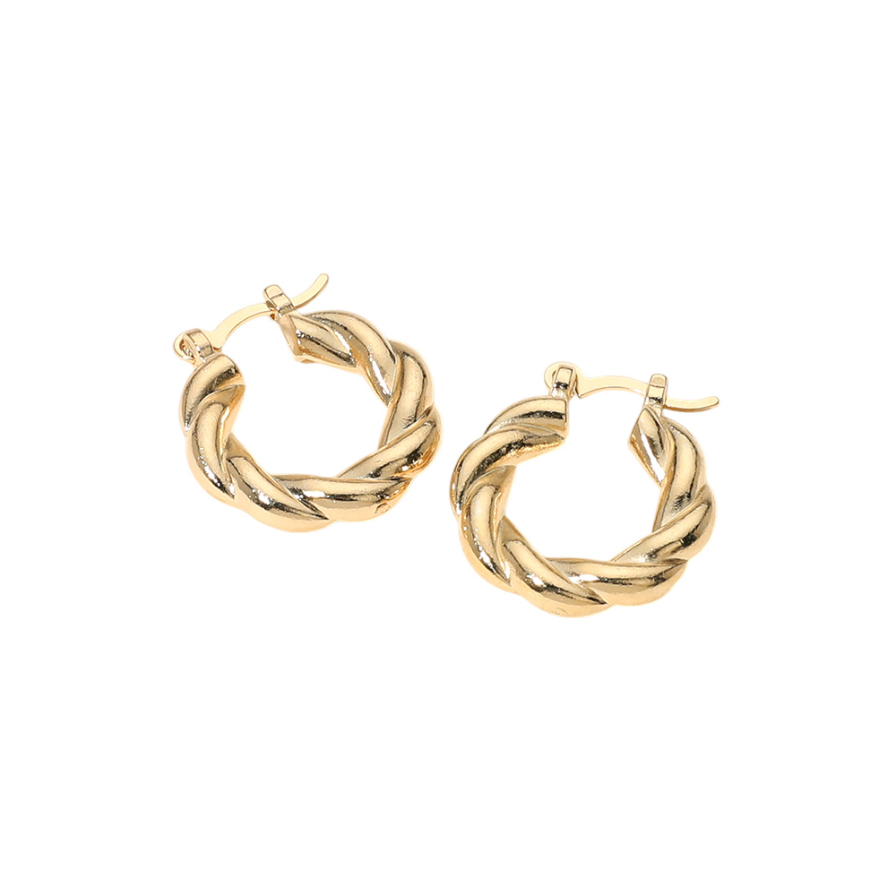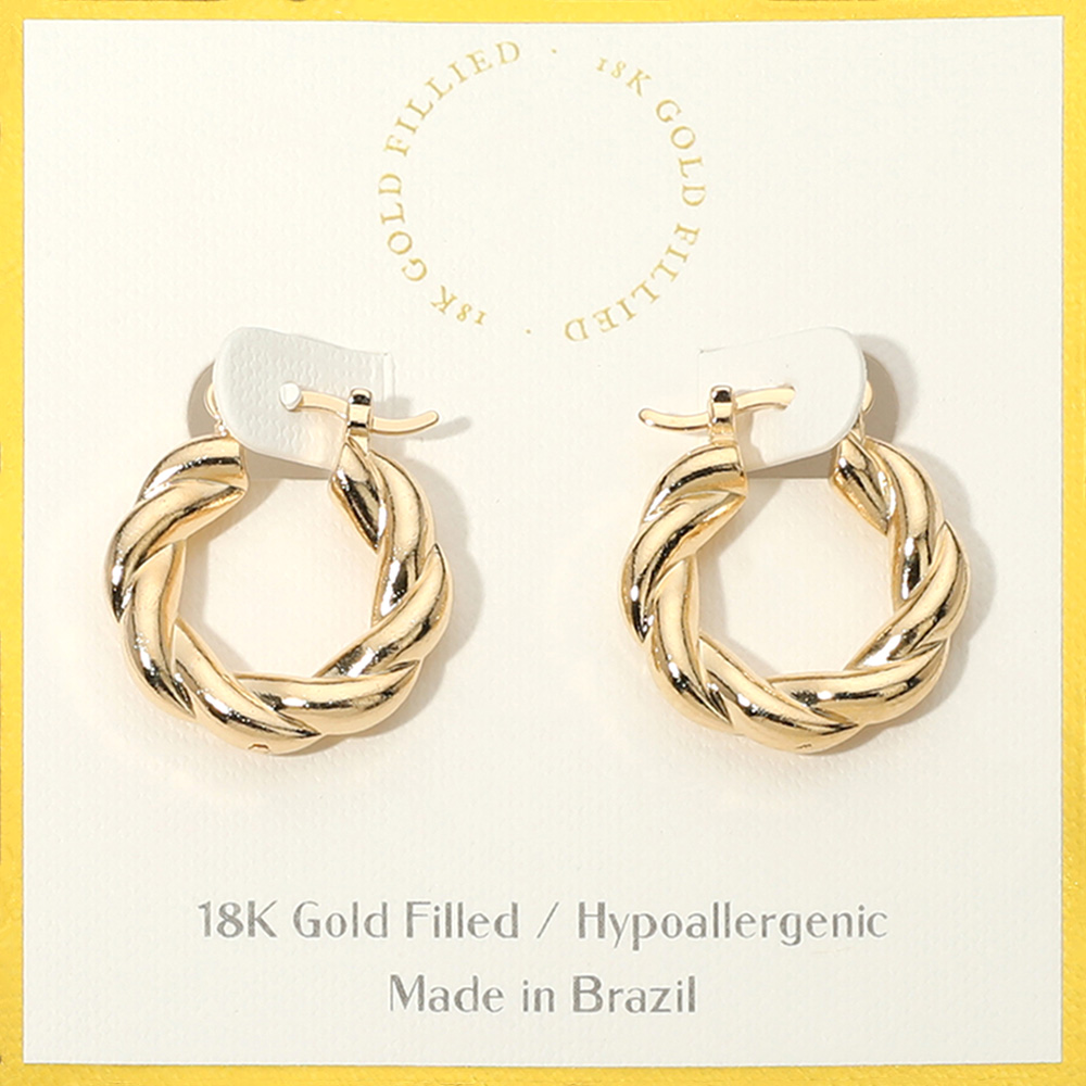 Details • Size : 0.9" X 1" • Pin Catch • These twisted hoop earrings showcase a sophisticated braided design, adding depth and movement to a timeless silhouette. Their bold yet elegant look makes them a standout piece for both everyday wear and elevated styling. Lightweight and easy to pair with any look. • Lead and Nickel Compliant • Hypoallergenic • Gold Filled • Made In Brazil