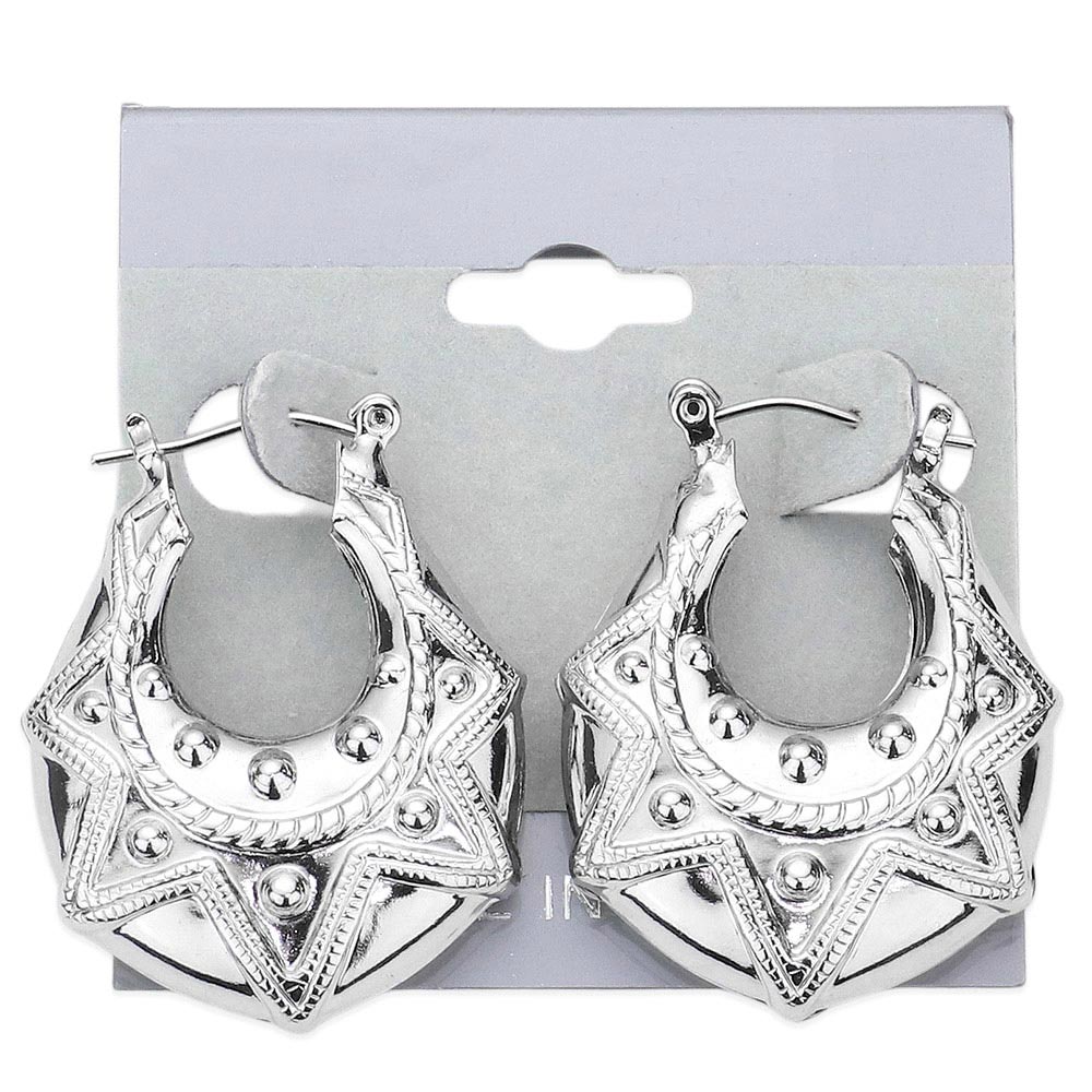 Details • Size : 1.2" X 1.4" • Pin Catch • Made In USA • Stand out with these striking hoop earrings featuring a starburst-inspired geometric shape accented by raised dotted details. Their bold textured design adds a celestial edge, making them the perfect statement piece for both casual and evening styles.