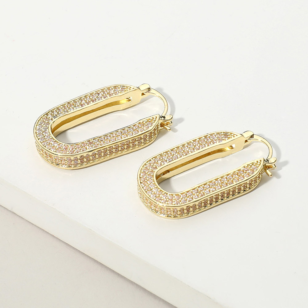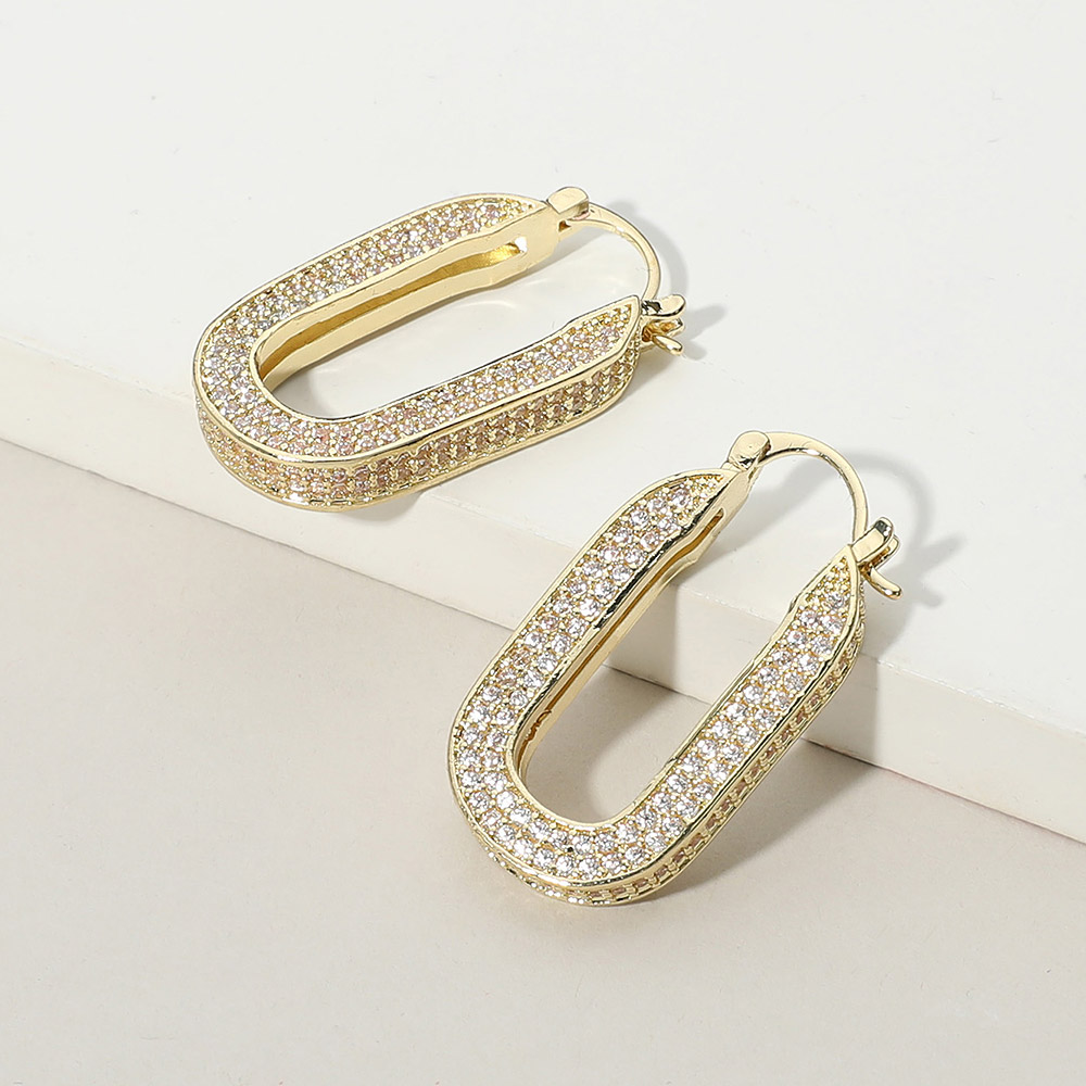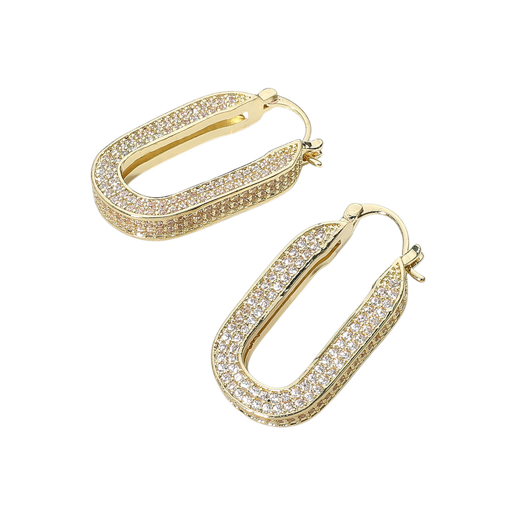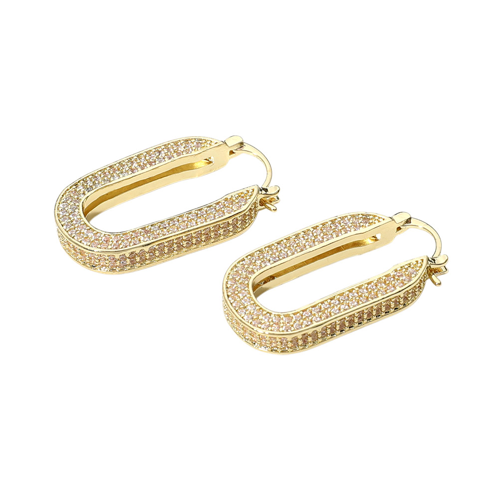 Gold Dipped CZ Stone Paved Oval Pin Catch Hoop Earrings