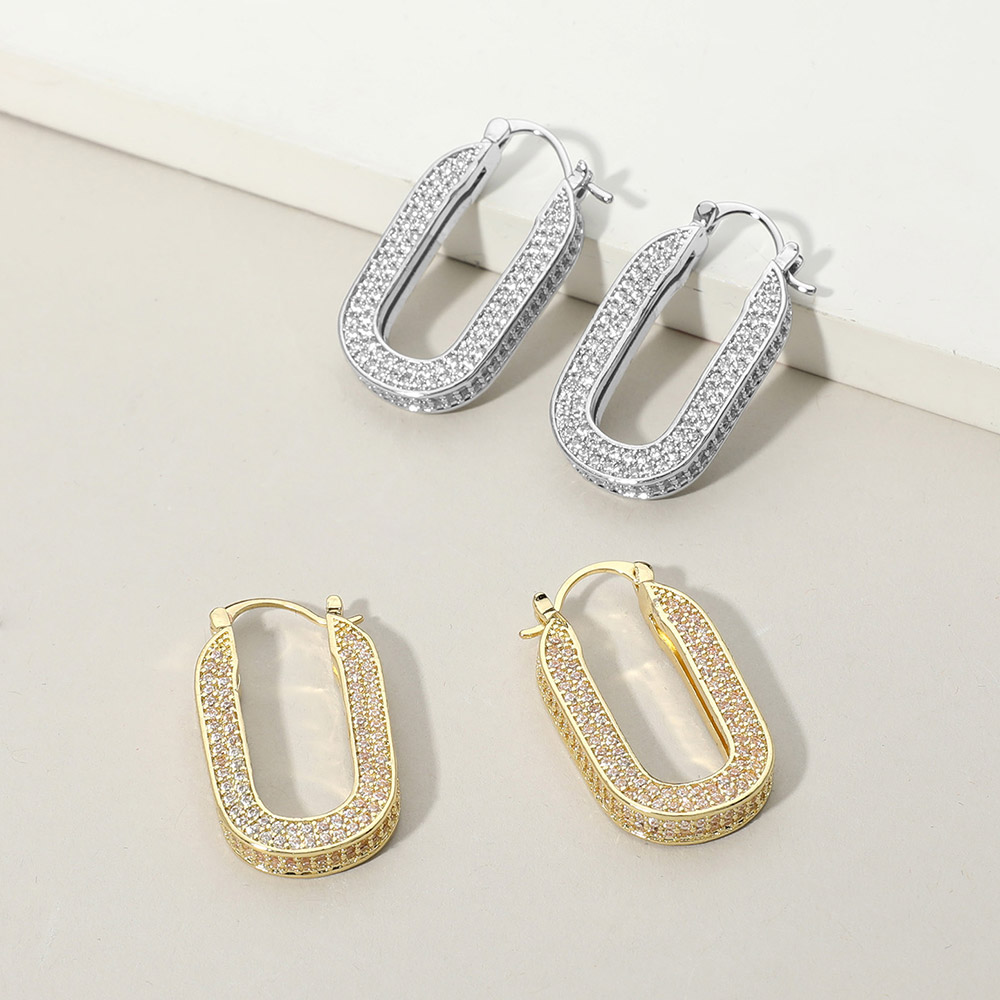 White Gold Dipped CZ Stone Paved Oval Pin Catch Hoop Earrings