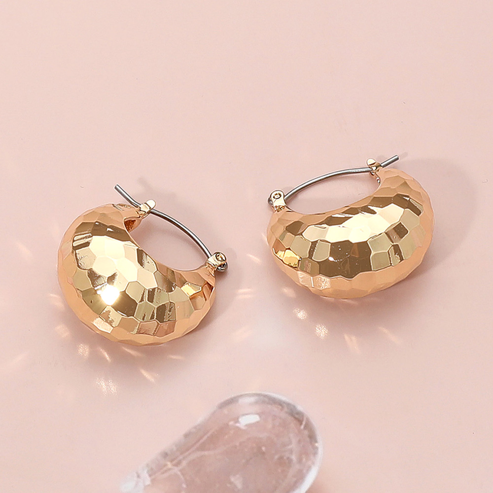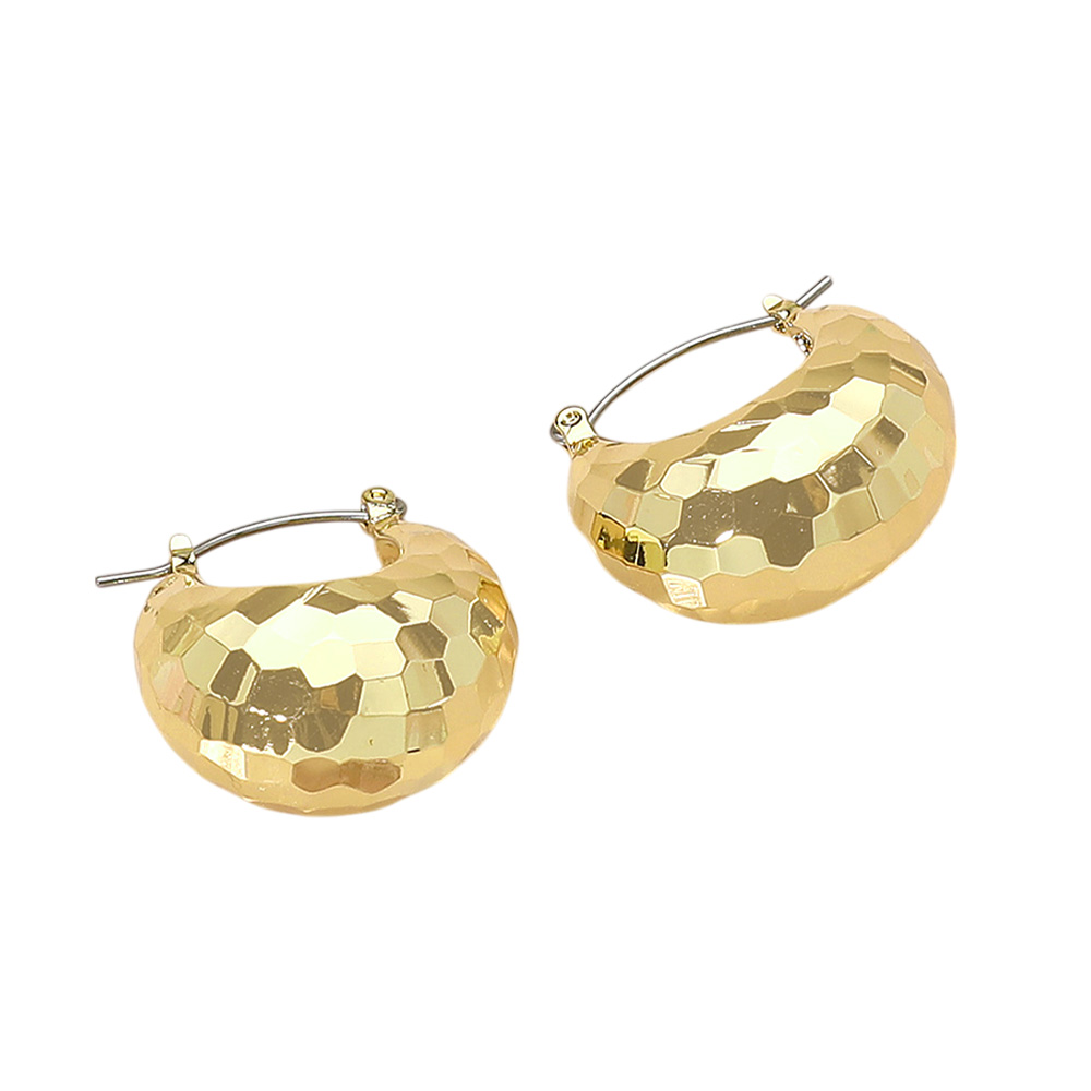 Details • Size : 1" X 1" • Pin Catch • Make a bold style statement with these chunky faceted hoop earrings. Designed with a textured finish that catches the light from every angle, these hoops are both modern and versatile, perfect for elevating everyday looks or adding sparkle to evening outfits. • Lead and Nickel Compliant