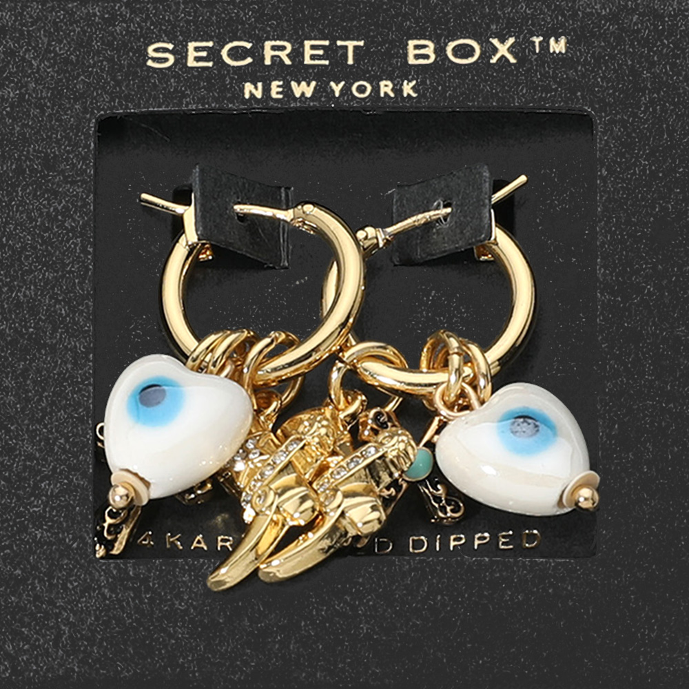SECRET BOX_Sterling Dipped Ceramic Evil Eye Heart Cross Western Boot Charm Dangle Pin Catch Hoop Earrings