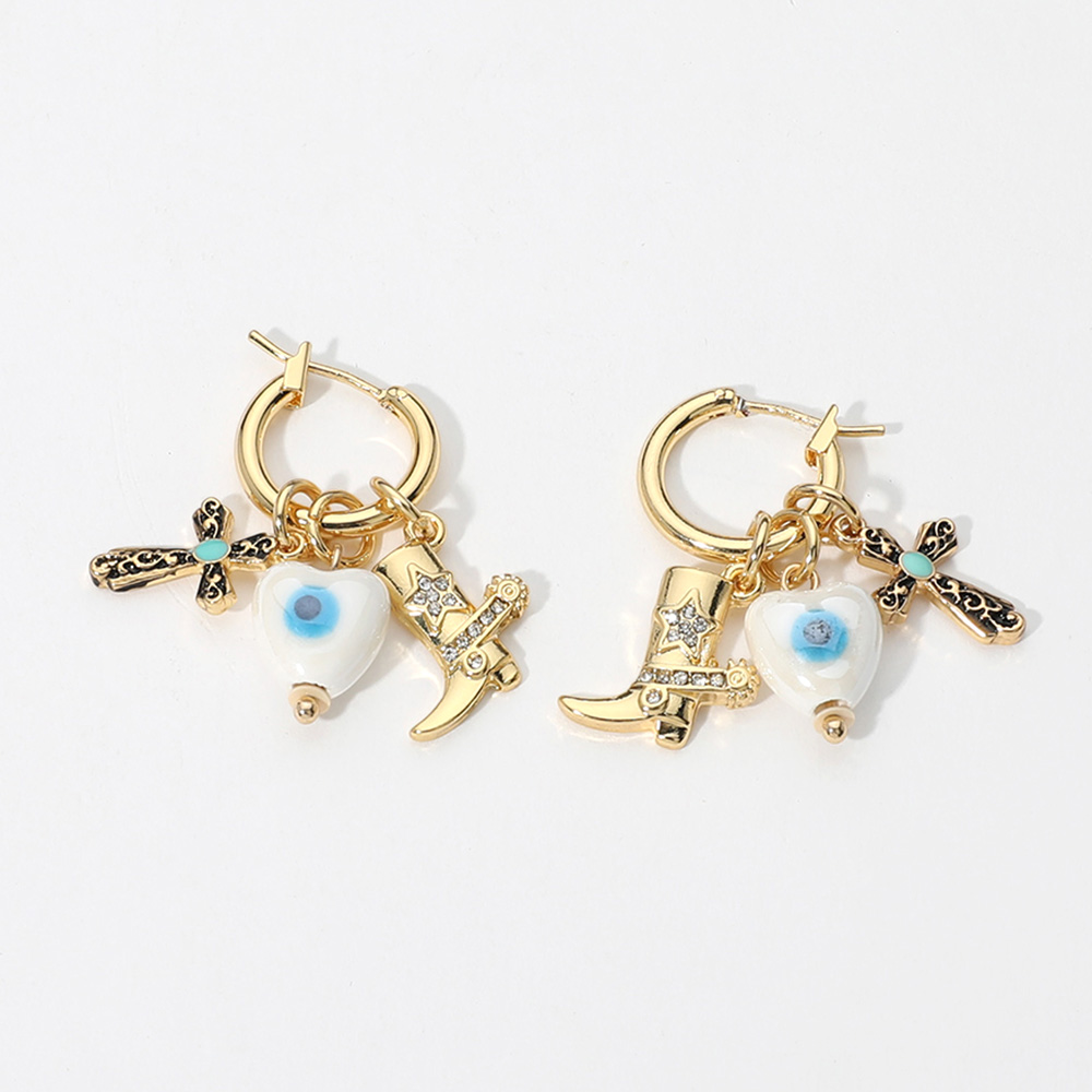SECRET BOX_14K Gold Dipped Ceramic Evil Eye Heart Cross Western Boot Charm Dangle Pin Catch Hoop Earrings