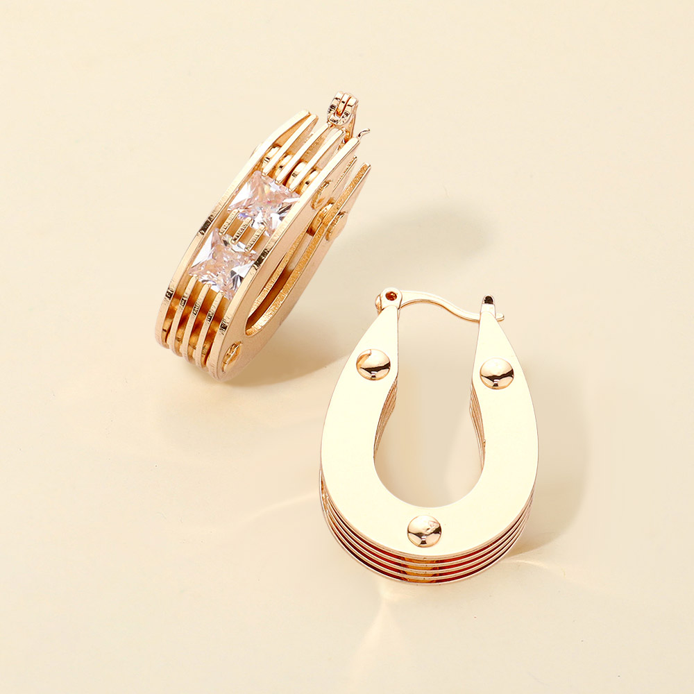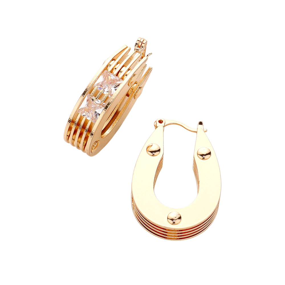 Details • Size : 0.8" X 1.2" • Pin Catch • Bold geometric hoop earrings with layered metal design and central square accent stone. Perfect for adding modern sophistication to casual, office, or evening looks with a statement touch. • Lead and Nickel Compliant • Brass