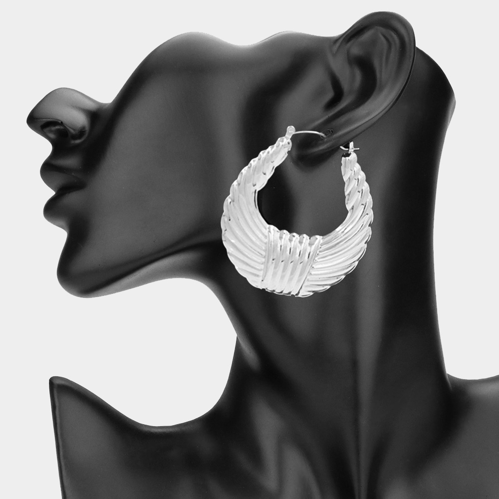 Details • Size : 1.8" X 2" • Pin Catch • Make a statement with these bold textured crescent hoop earrings featuring a unique ridged design. Lightweight and versatile, they add an elegant edge to any outfit, perfect for elevating both everyday looks and evening ensembles with modern, chic appeal. • Lead and Nickel Compliant