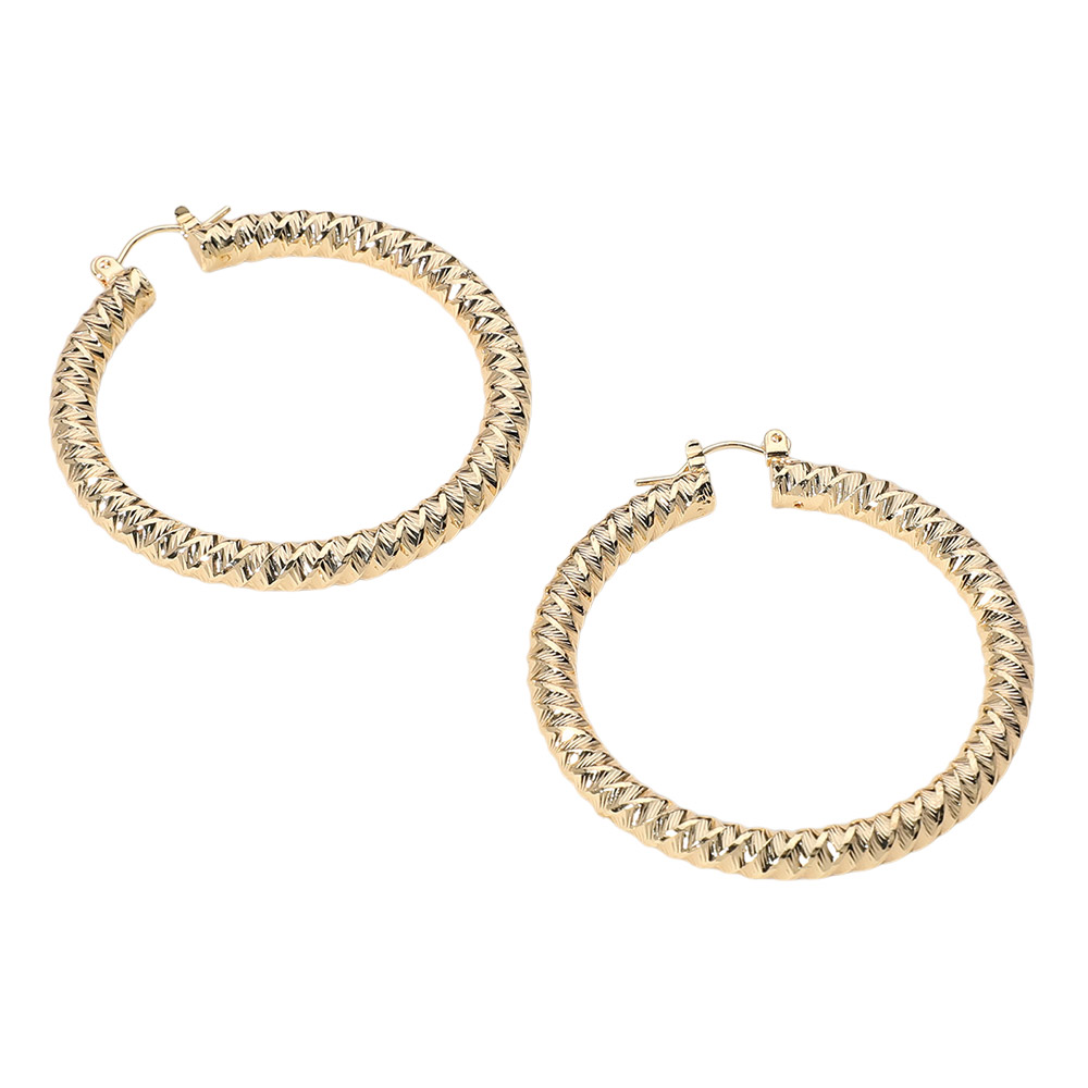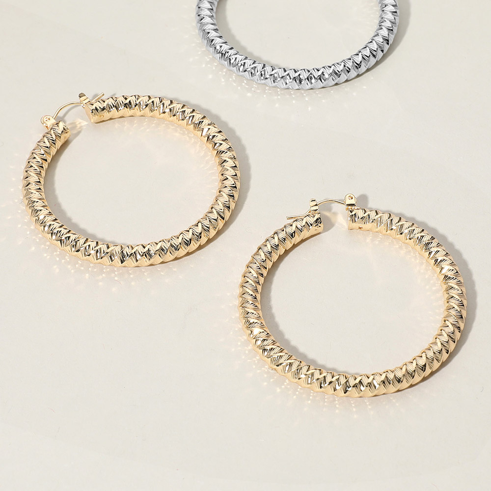 • Statement round hoop earrings designed with a bold, braided-like texture in a classic circular shape. Ideal for everyday or evening wear with modern flair.