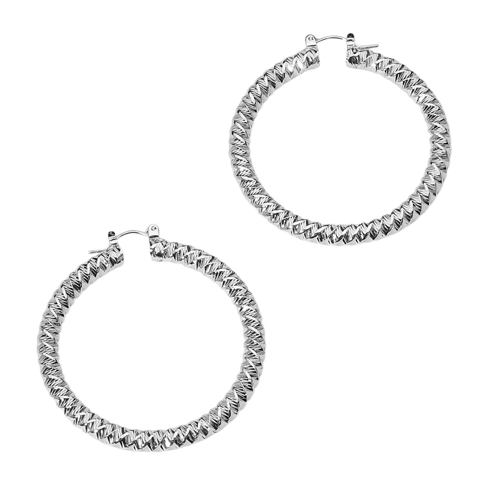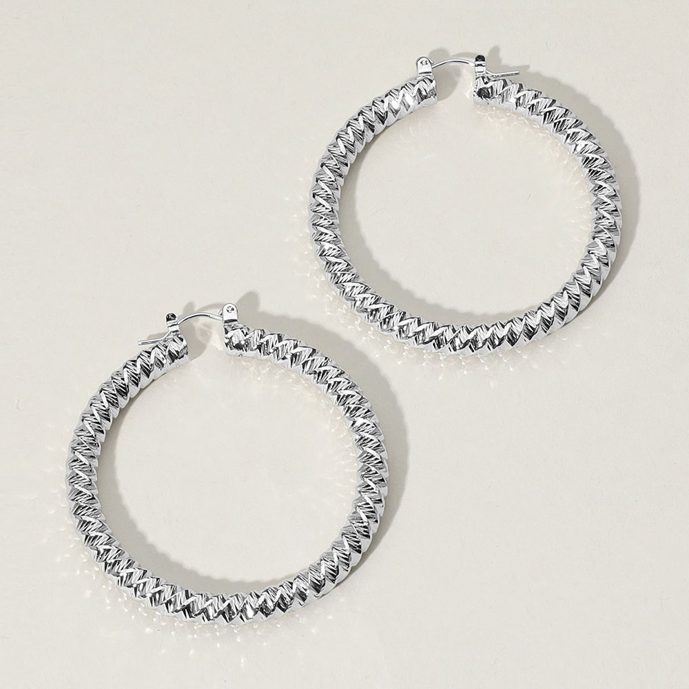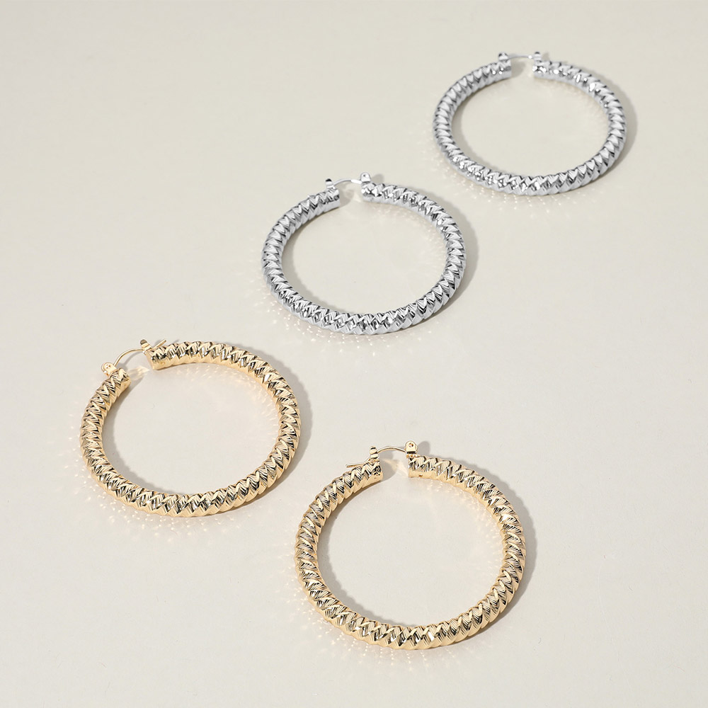 • Statement round hoop earrings designed with a bold, braided-like texture in a classic circular shape. Ideal for everyday or evening wear with modern flair.