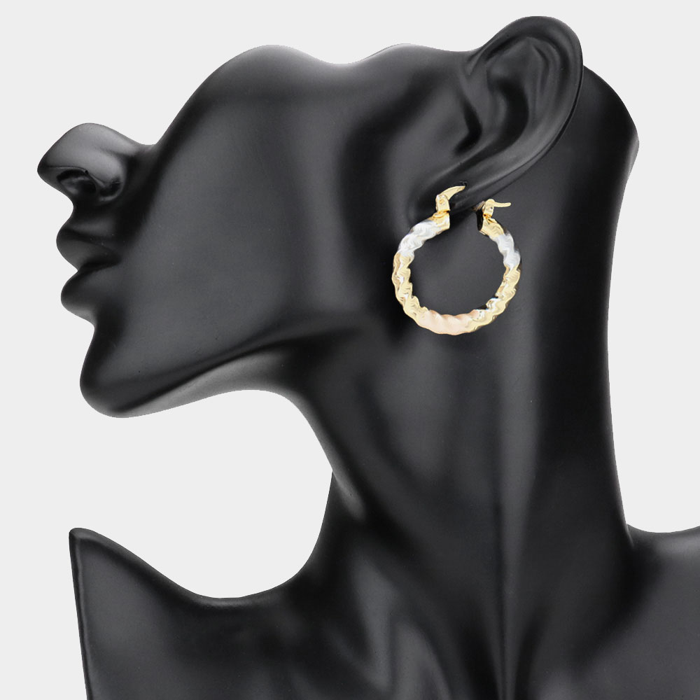 Textured Three Tone Metal Hoop Pin Catch Earrings
