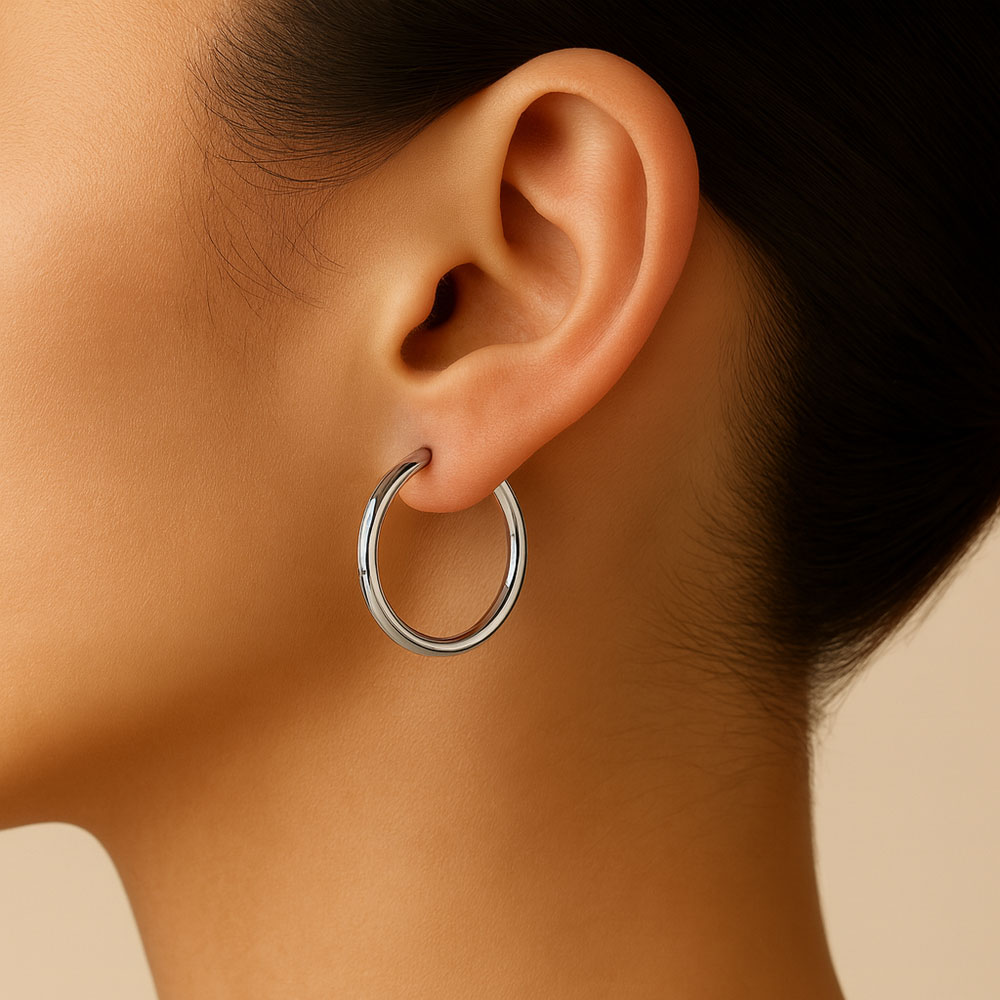Details • Size : 1.2" X 1.2" • Pin Catch • Water resistant plating • Elegant small hoop earrings designed for effortless everyday style. Lightweight and versatile, these timeless hoops bring a polished finish to any outfit, making them the perfect accessory for both casual and professional looks. • Brass • Gold Dipped • Hypoallergenic • Lead and Nickel Compliant • Made In Korea
