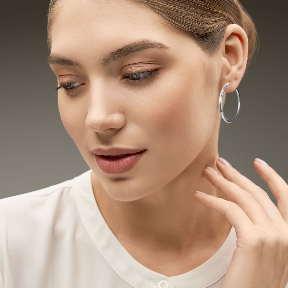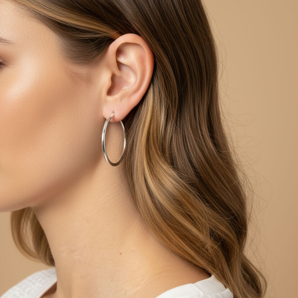 • Chic medium-small hoop earrings with a sleek, lightweight design. Perfect for everyday wear, these hoops strike the balance between subtle and stylish, offering versatile elegance that easily complements casual or professional looks.