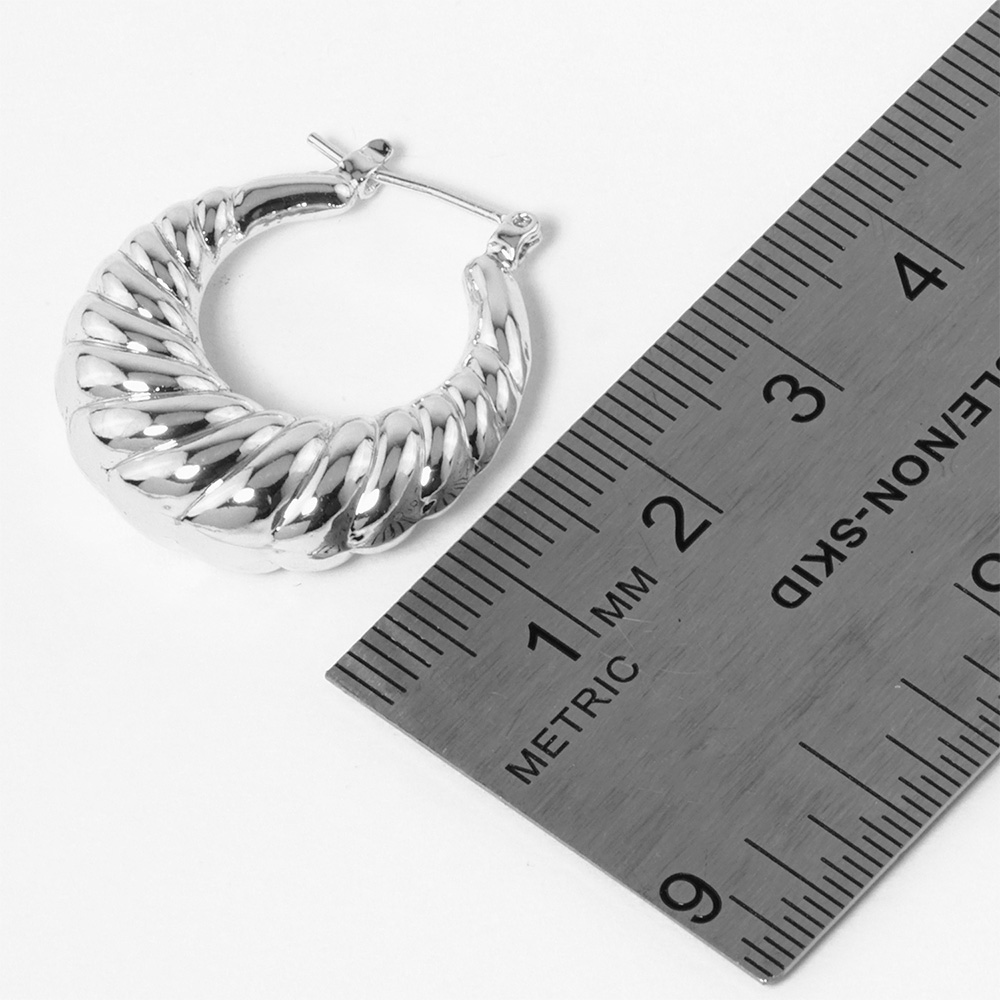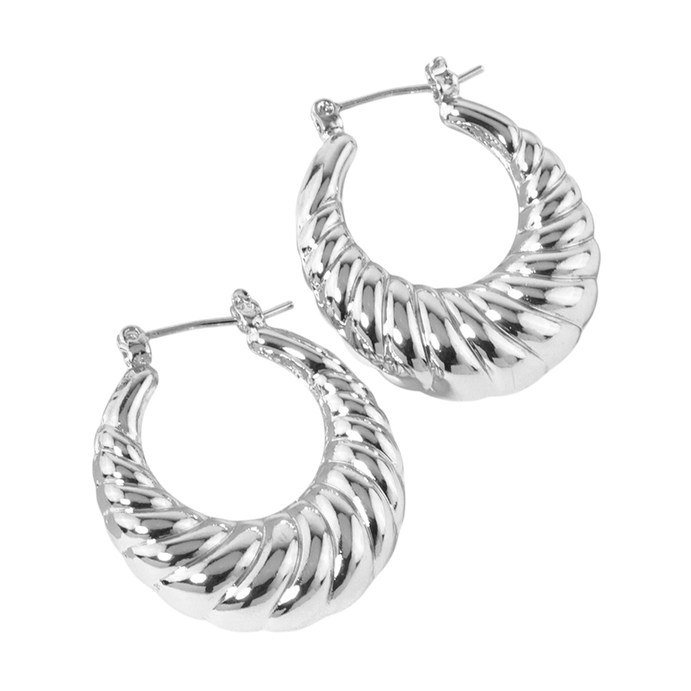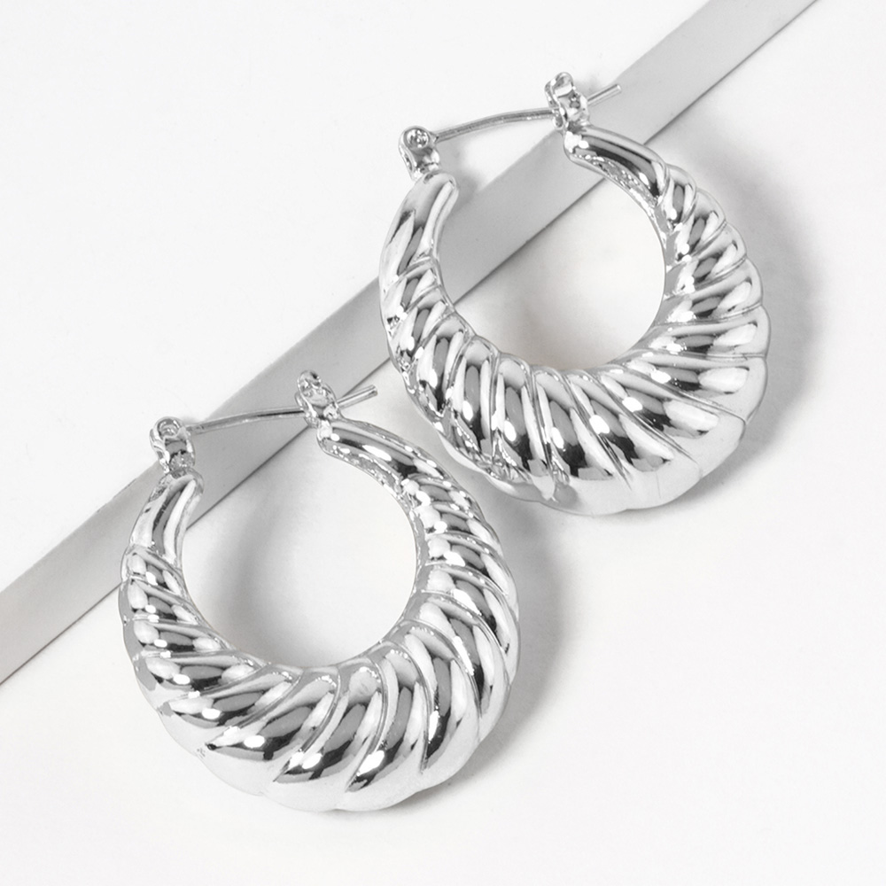 White Gold Dipped Croissant Textured Pin Catch Hoop Earrings