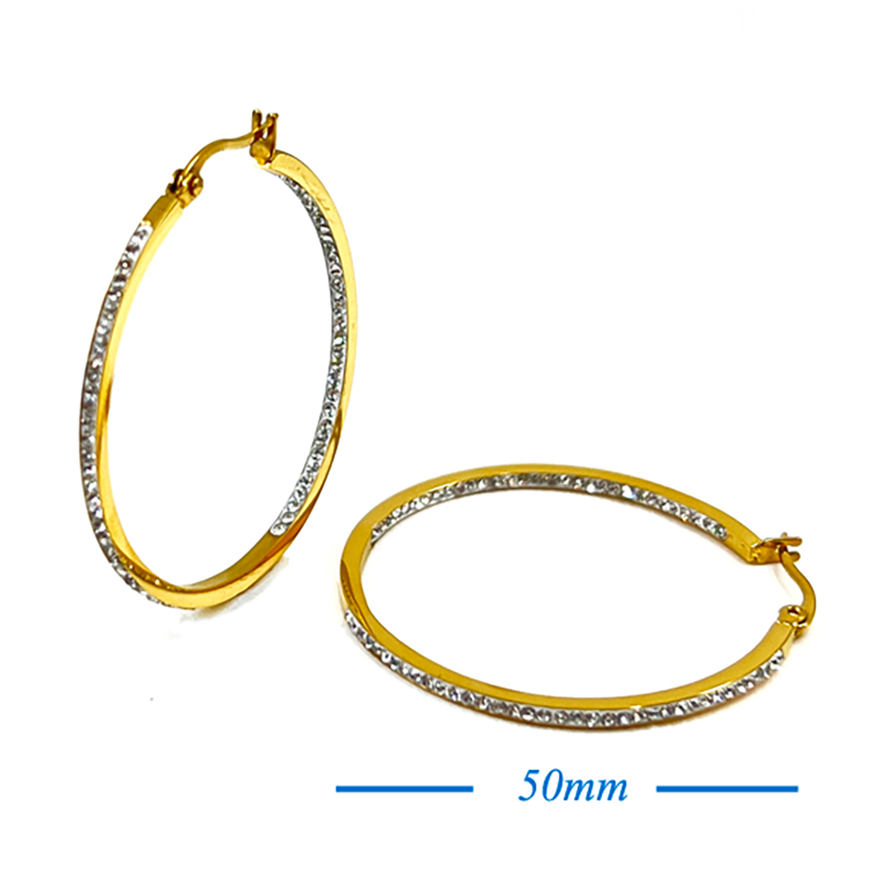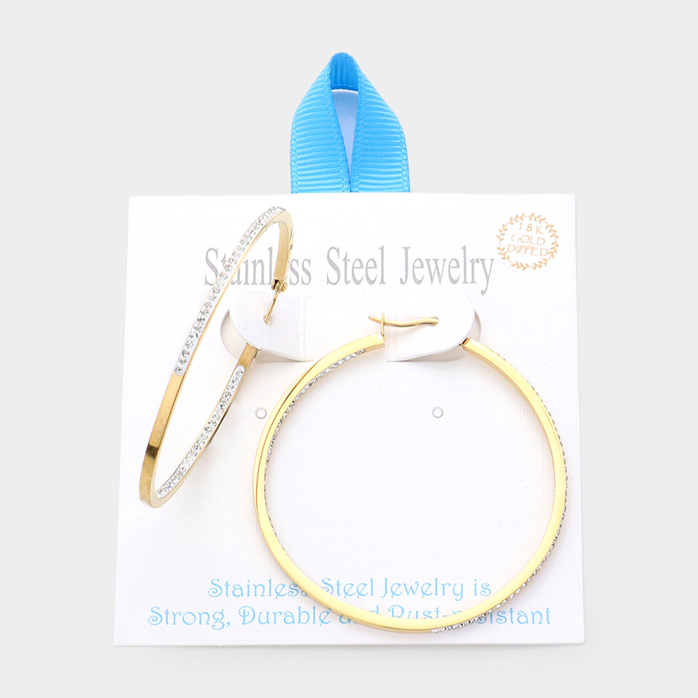 18K Gold Dipped Stainless Steel 2 Inch Inside Out Rhinestone Hoop Pin Catch Earrings