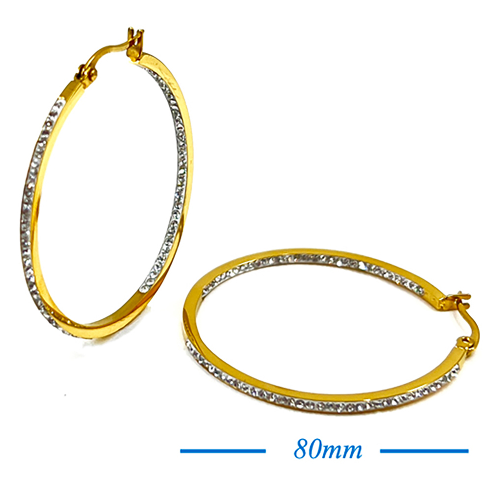 18K Gold Dipped Stainless Steel 3.2 Inch Inside Out Rhinestone Hoop Pin Catch Earrings