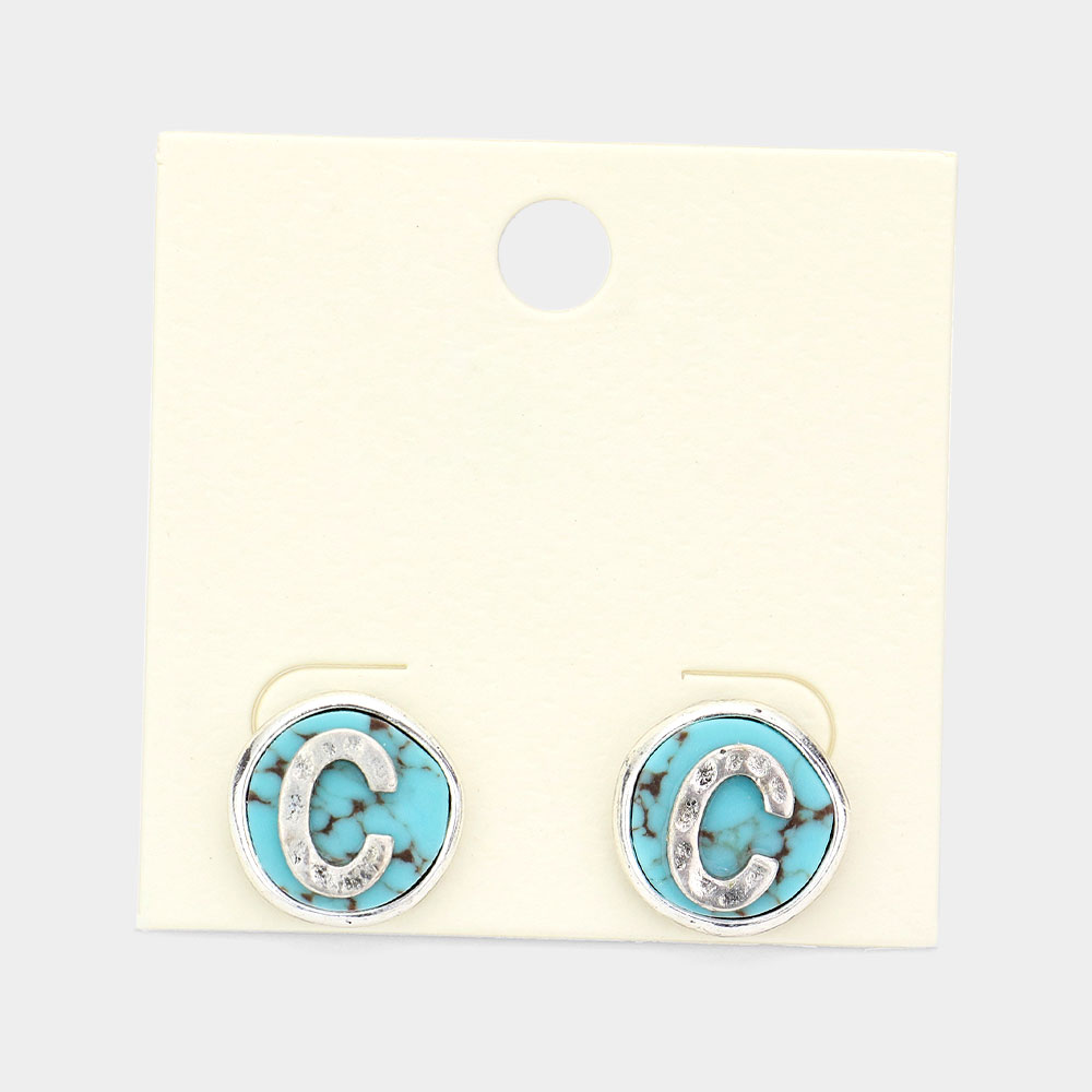 -C- Initial Monogram Turquoise Charm Faceted Beaded Stretch Bracelet