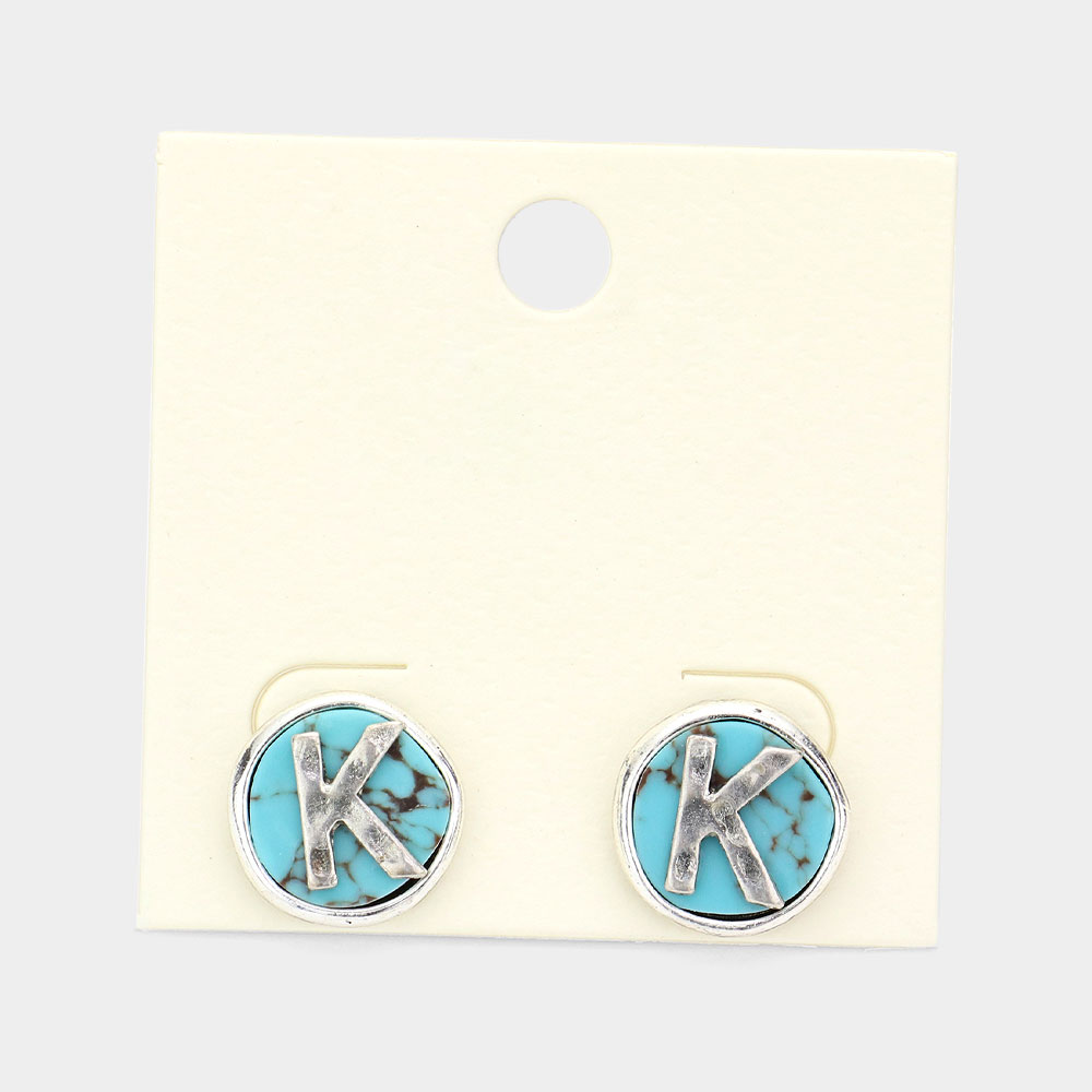 -K- Initial Monogram Turquoise Charm Faceted Beaded Stretch Bracelet