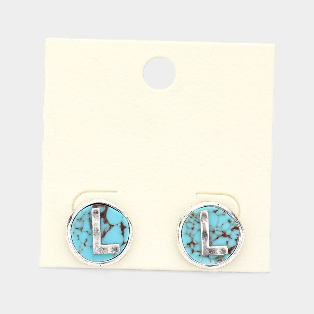 -L- Initial Monogram Turquoise Charm Faceted Beaded Stretch Bracelet