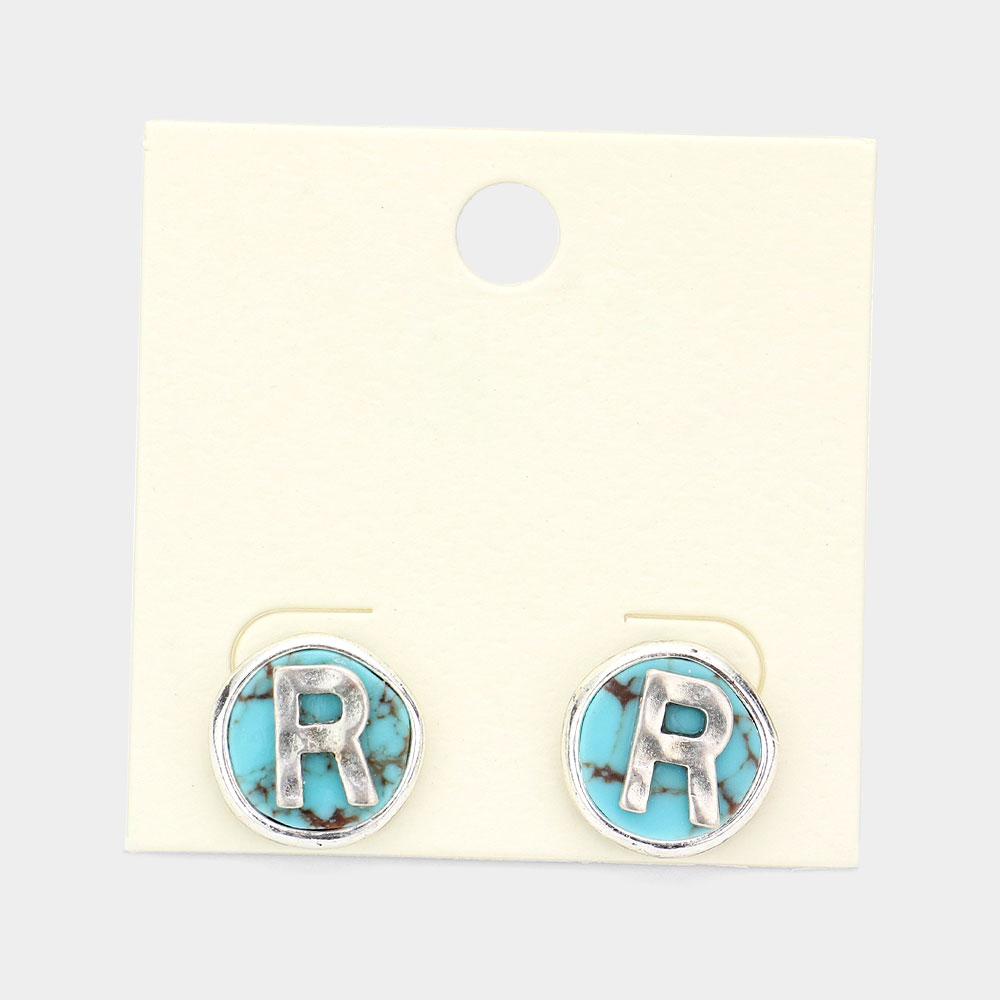 -R- Initial Monogram Turquoise Charm Faceted Beaded Stretch Bracelet