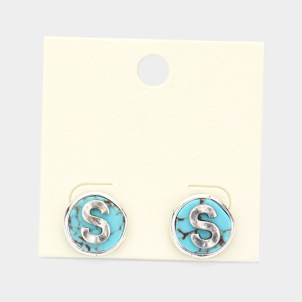 -S- Initial Monogram Turquoise Charm Faceted Beaded Stretch Bracelet