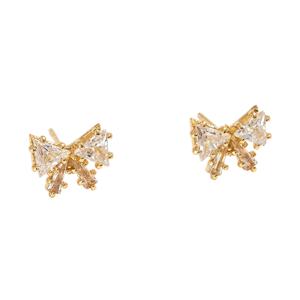 Details • Size : 0.5" X 0.4" • Post Back • These bow shaped stud earrings feature a delicate design highlighted with sparkling accents. Perfect for everyday wear or special occasions, they add a feminine touch and timeless charm while keeping your look chic, versatile, and effortlessly stylish. • Lead and Nickel Compliant • Hypoallergenic • Made In Korea • Gold Dipped • Brass