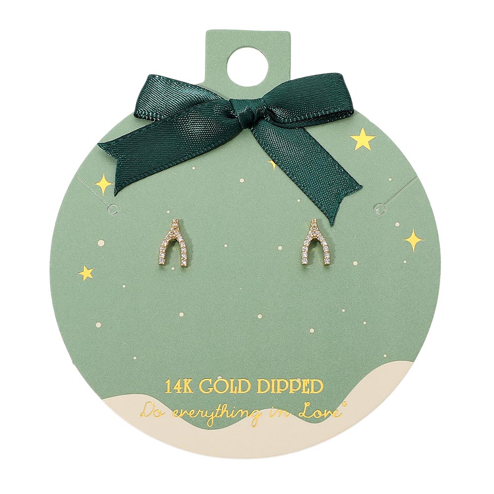 Details • Size : 0.25" X 0.4" • Post Back • Elegant wishbone stud earrings featuring a slim, sparkling design with stone accents. A refined 14K gold dipped accessory perfect for everyday wear or gifting, adding a subtle touch of charm and sophistication to any look. • Gold Dipped • Hypoallergenic • Lead and Nickel Compliant • Made In Korea