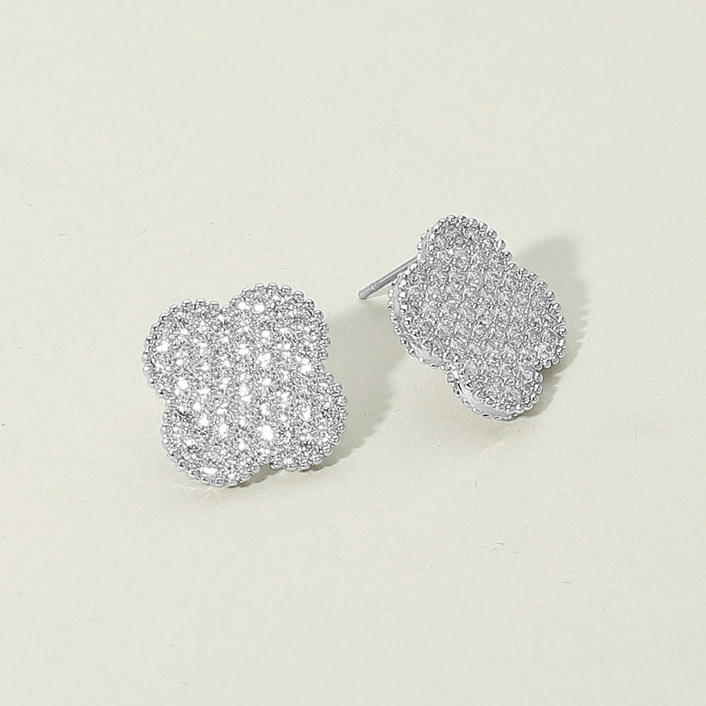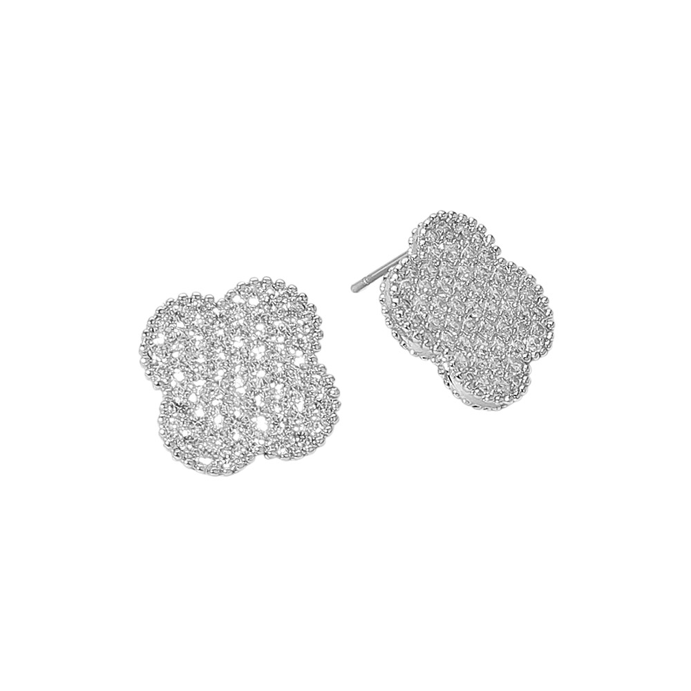 • Bring luck and elegance to your style with these quatrefoil stud earrings, beautifully encrusted with shimmering pavĂ© crystals. The delicate textured edges add refined detail, making them perfect for both casual and formal wear. A timeless jewelry piece for every collection.