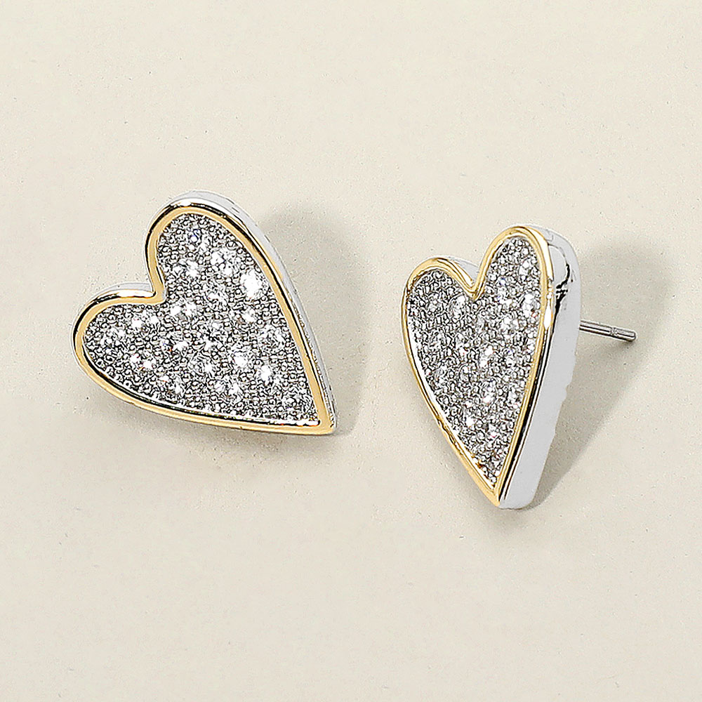 14K Gold Plated Two Tone CZ Stone Paved Heart Stud Earrings
