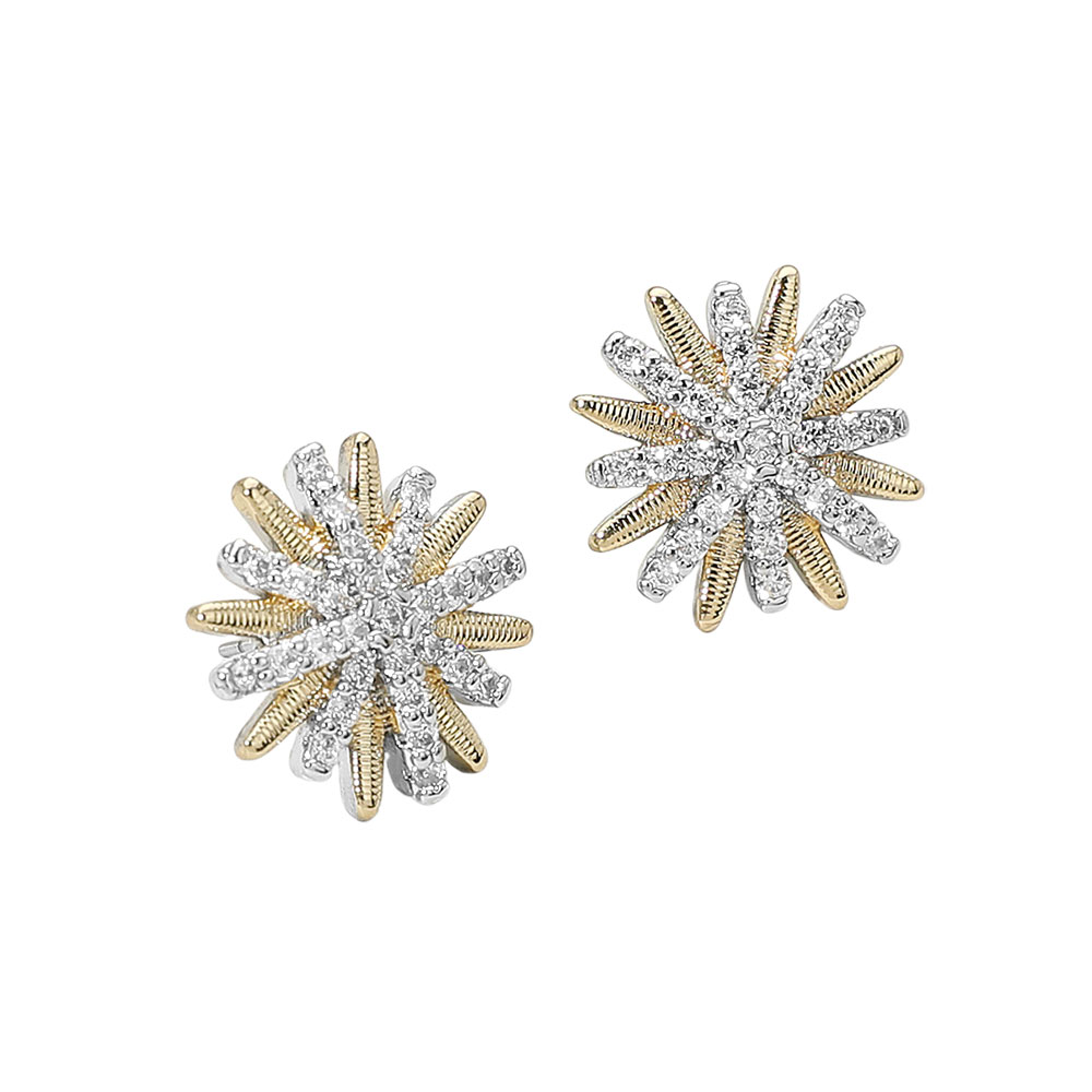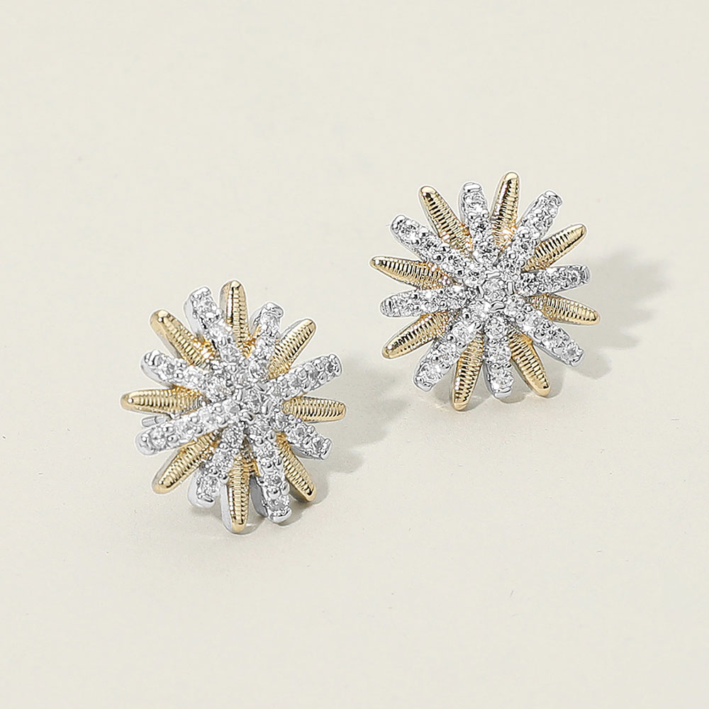 Details • Size : 0.6" X 0.6" • Post Back • Chic starburst stud earrings with radiant crystal detailing and intricate textured accents. These dazzling earrings bring elegance and shine to any outfit, perfect for formal events, parties, or daily wear when you want to add a touch of glamour and sophistication to your look. • CZ Cubic Zirconia • Gold Dipped