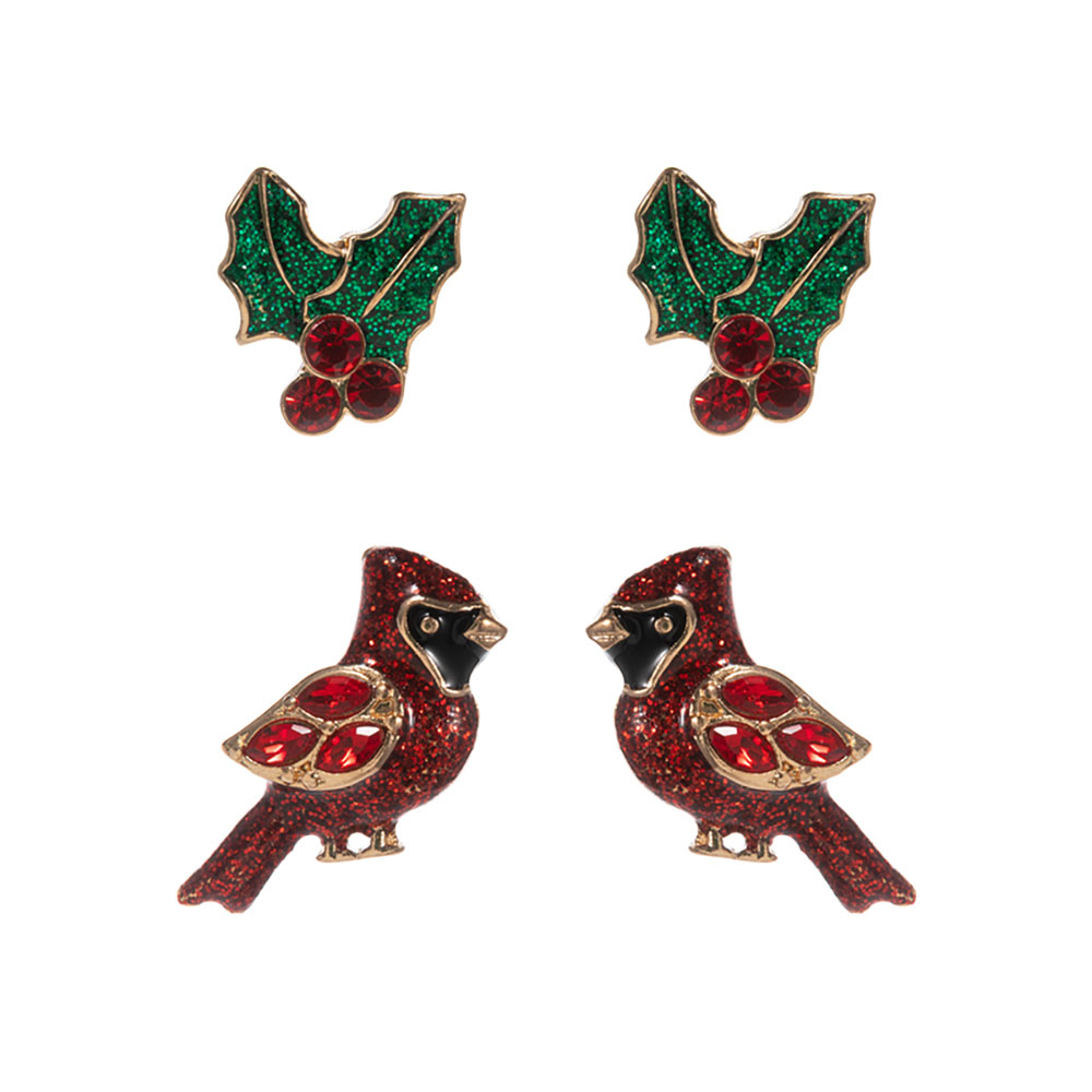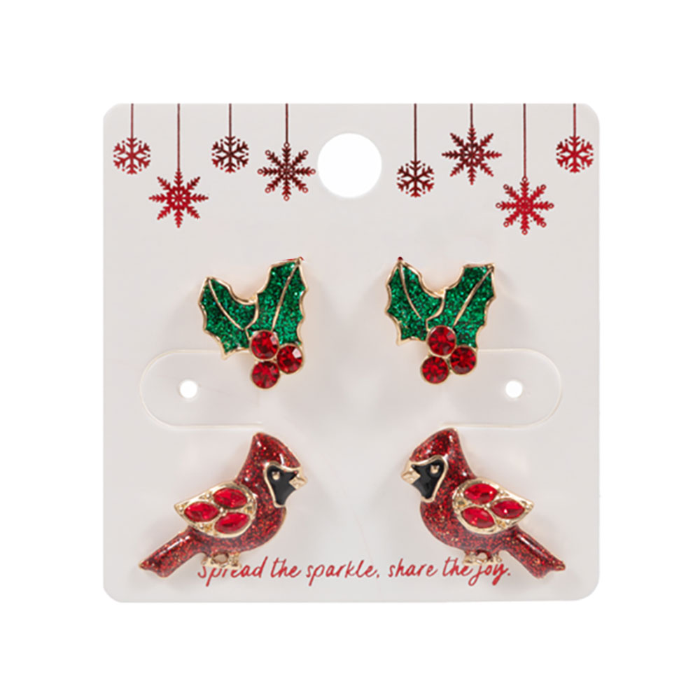 Details • Size : 0.7" - 0.75" L • Post Back • Charming holiday earring set featuring glittery cardinal bird and holly leaf designs. Perfect for adding a festive touch to winter outfits or as a seasonal gift. • Lead and Nickel Compliant