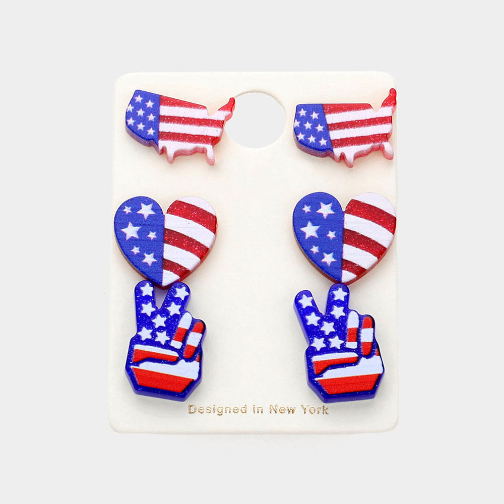 3PAIRS - American USA Flag Printed Resin Map Heart Victory Stud Earrings Set