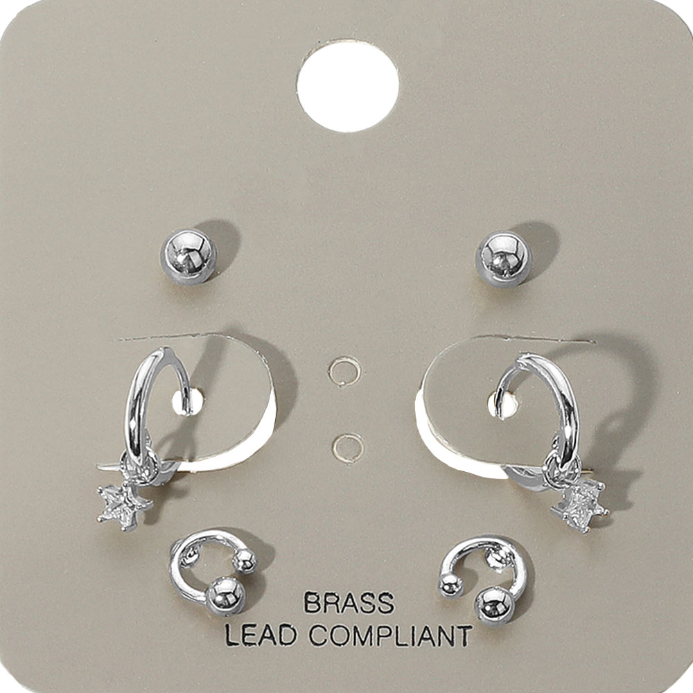Details • Size : 0.15" - 0.6" L • Post Back • Elegant earring set with three unique pairs featuring hoops with star charms, minimalist studs, and curved bars. A versatile addition to any jewelry collection, ideal for both casual and formal wear. • Lead and Nickel Compliant • Made In Korea • Brass