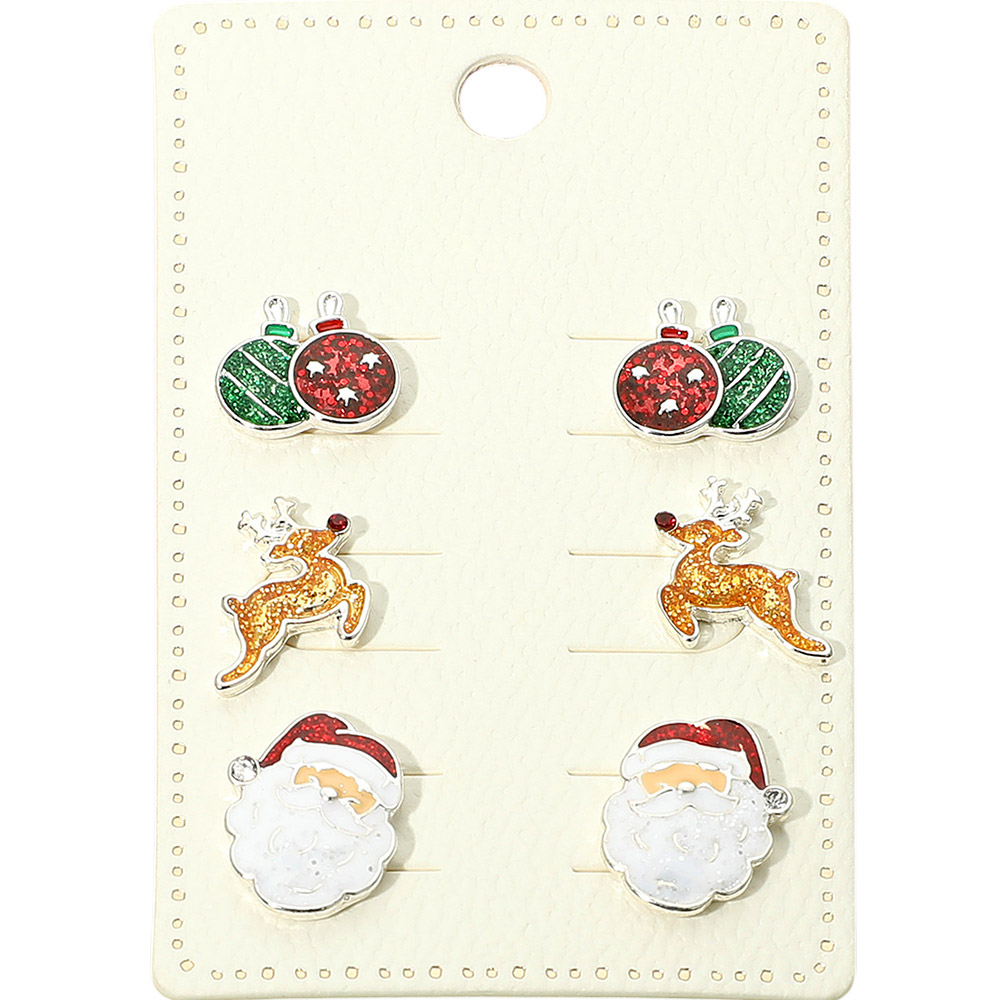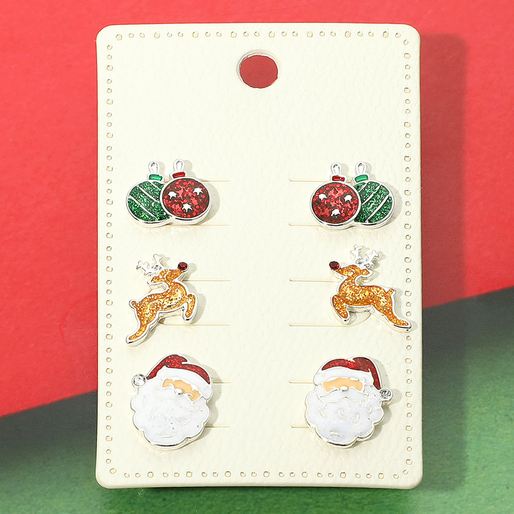 Details • Size : 0.4" - 0.6" L • Post Back • Festive 3-pair stud earring set featuring Santa Claus, glittery reindeer, and ornament designs. Perfect for holiday celebrations, these charming earrings add playful cheer to any seasonal outfit. • Lead and Nickel Compliant