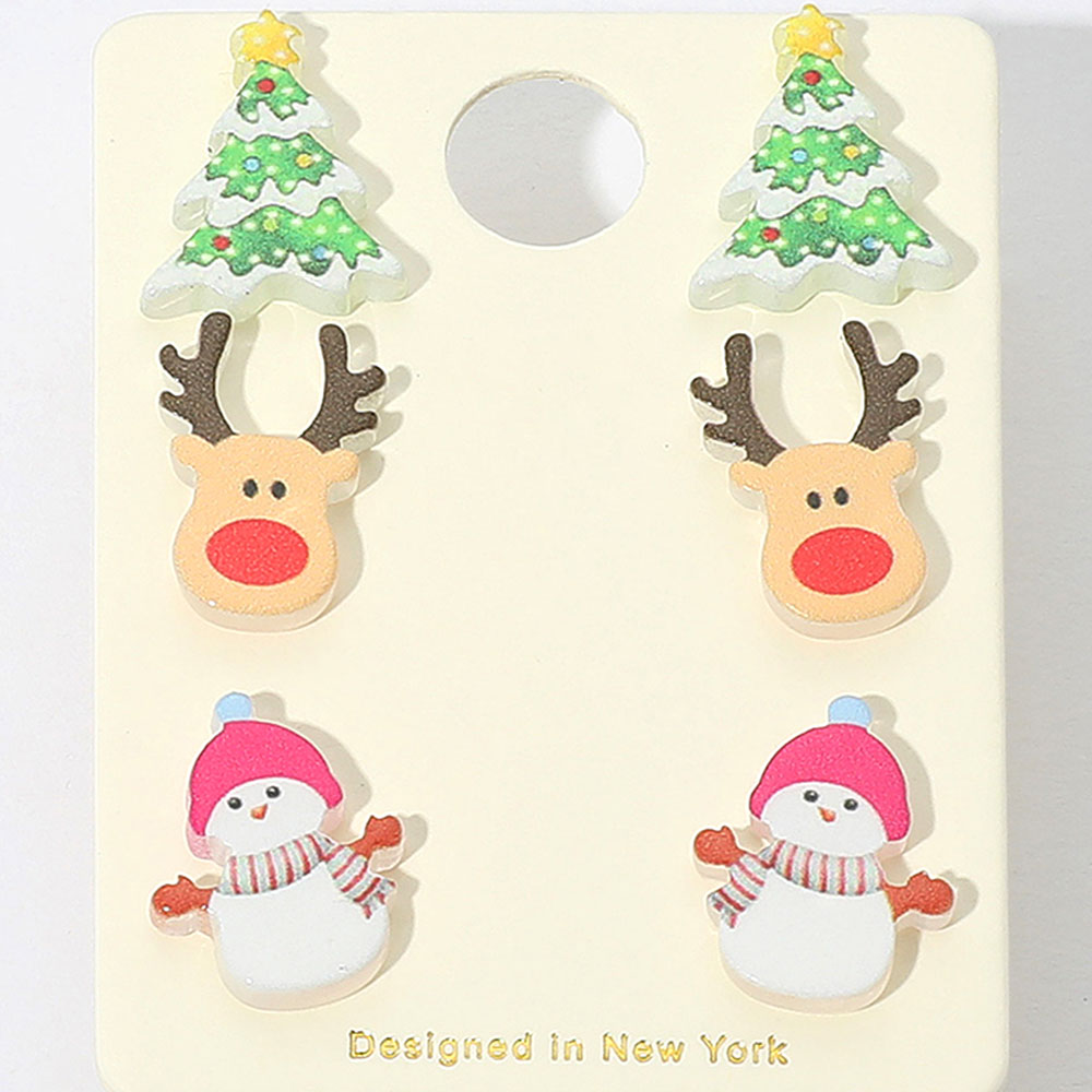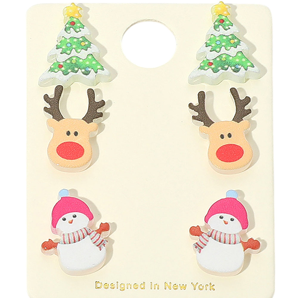 Details • Size : 0.5" - 0.6" L • Post Back • Celebrate the season with this festive 3-pair Christmas stud earring set, featuring playful designs including Christmas trees, reindeer faces, and cozy snowmen. A fun accessory for holiday outfits, parties, or gifting with cheerful winter flair. • Lead and Nickel Compliant