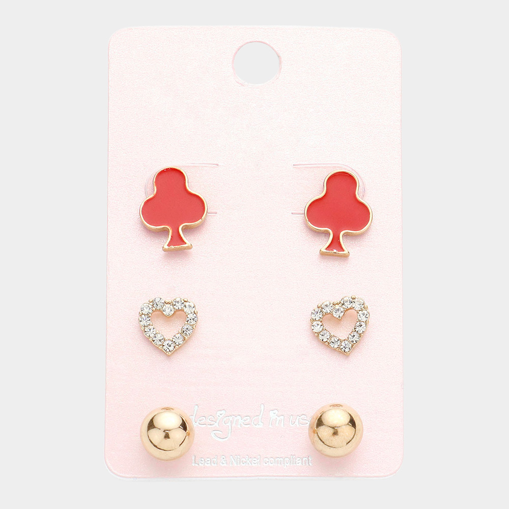 3Pairs - Clover Crystal Heart Metal Ball Stud Earrings