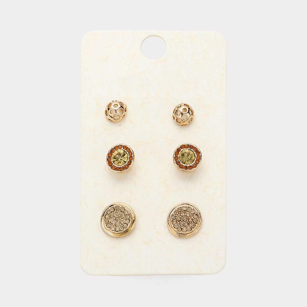 3Pairs - Cutout Metal Bubble Stone Round Stud Earrings