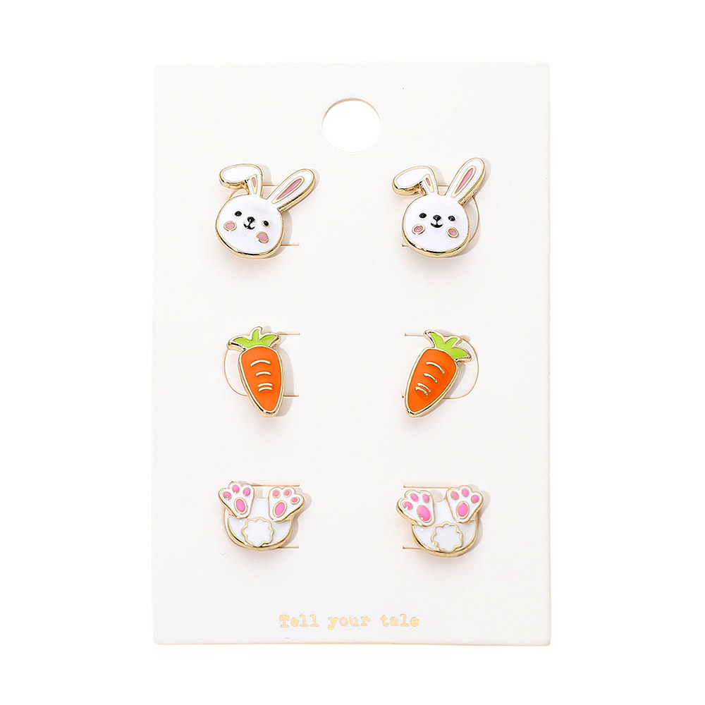 Details • Size : 0.4" - 0.6" L • Post Back • Add playful charm to your look with this three-pair stud earring set featuring smiling bunny faces, cute carrot designs, and paw-print motifs. Perfect for mixing and matching playful themes for casual outfits, seasonal wear, or thoughtful gifting. • Lead and Nickel Compliant