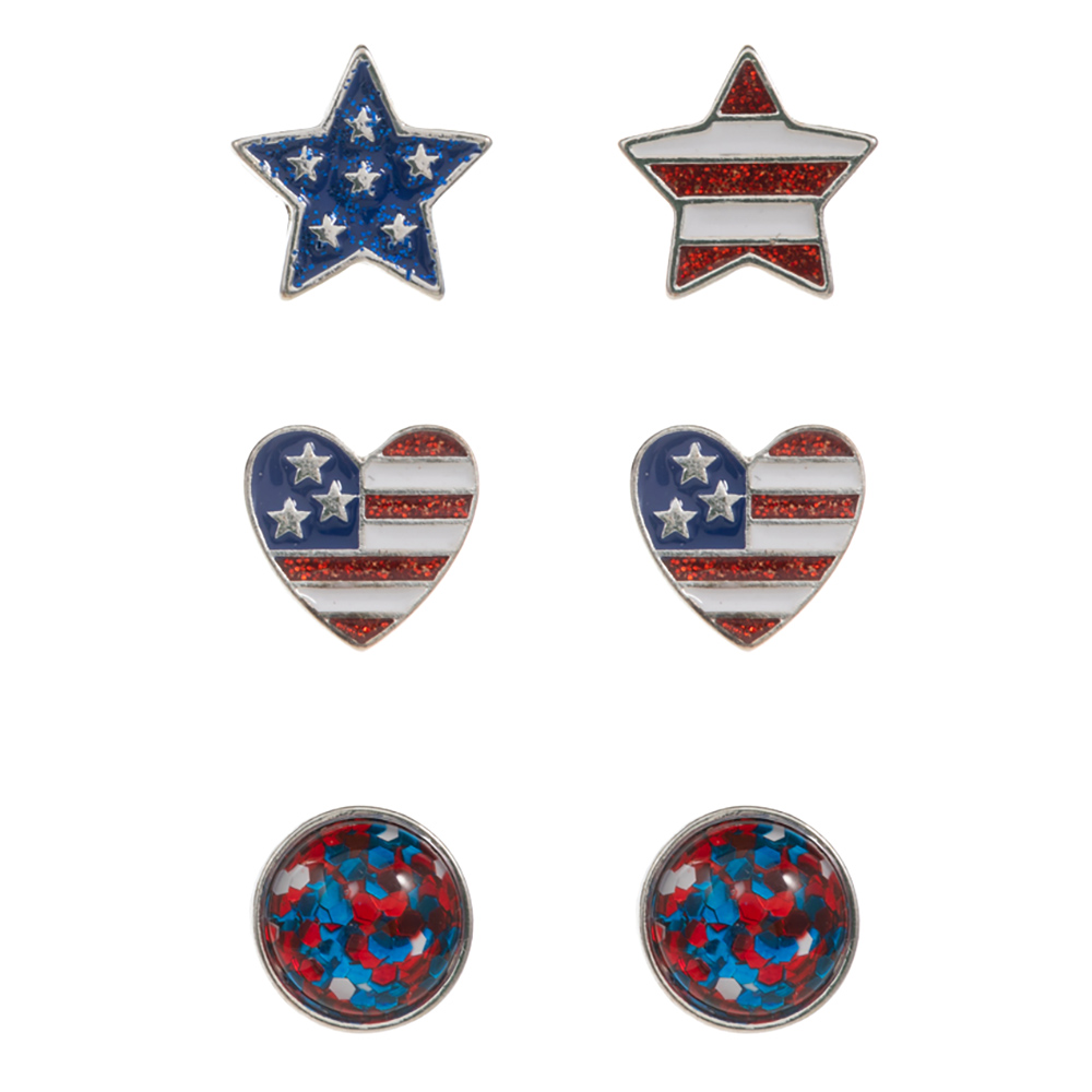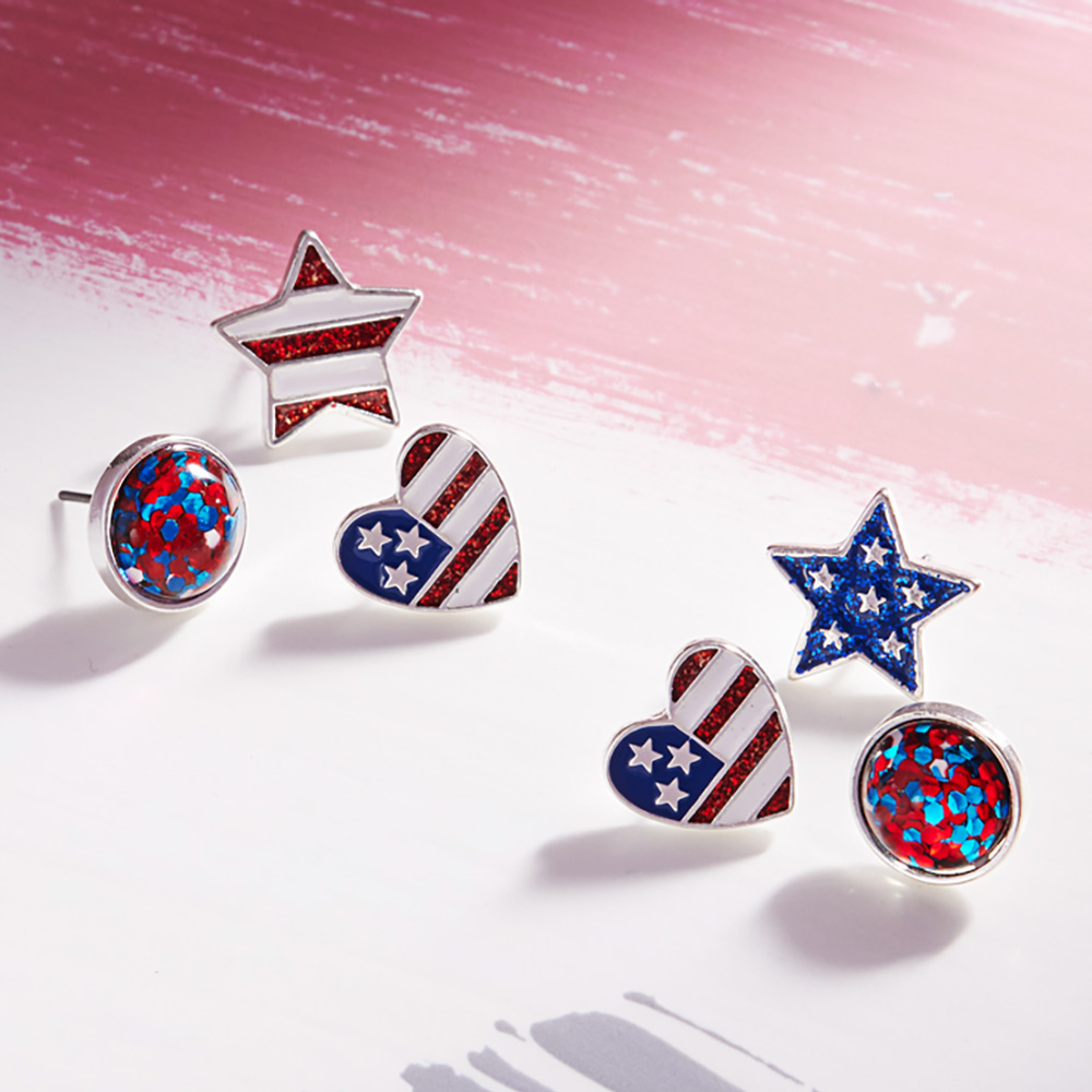 Details • Size : 0.5" L - 0.6" L • Titanium Post Back • Show off your American pride with this festive stud earring set featuring stars, hearts, and flag motifs. A stylish patriotic jewelry collection perfect for celebrating national holidays and everyday flair. • Lead and Nickel Compliant • Hypoallergenic