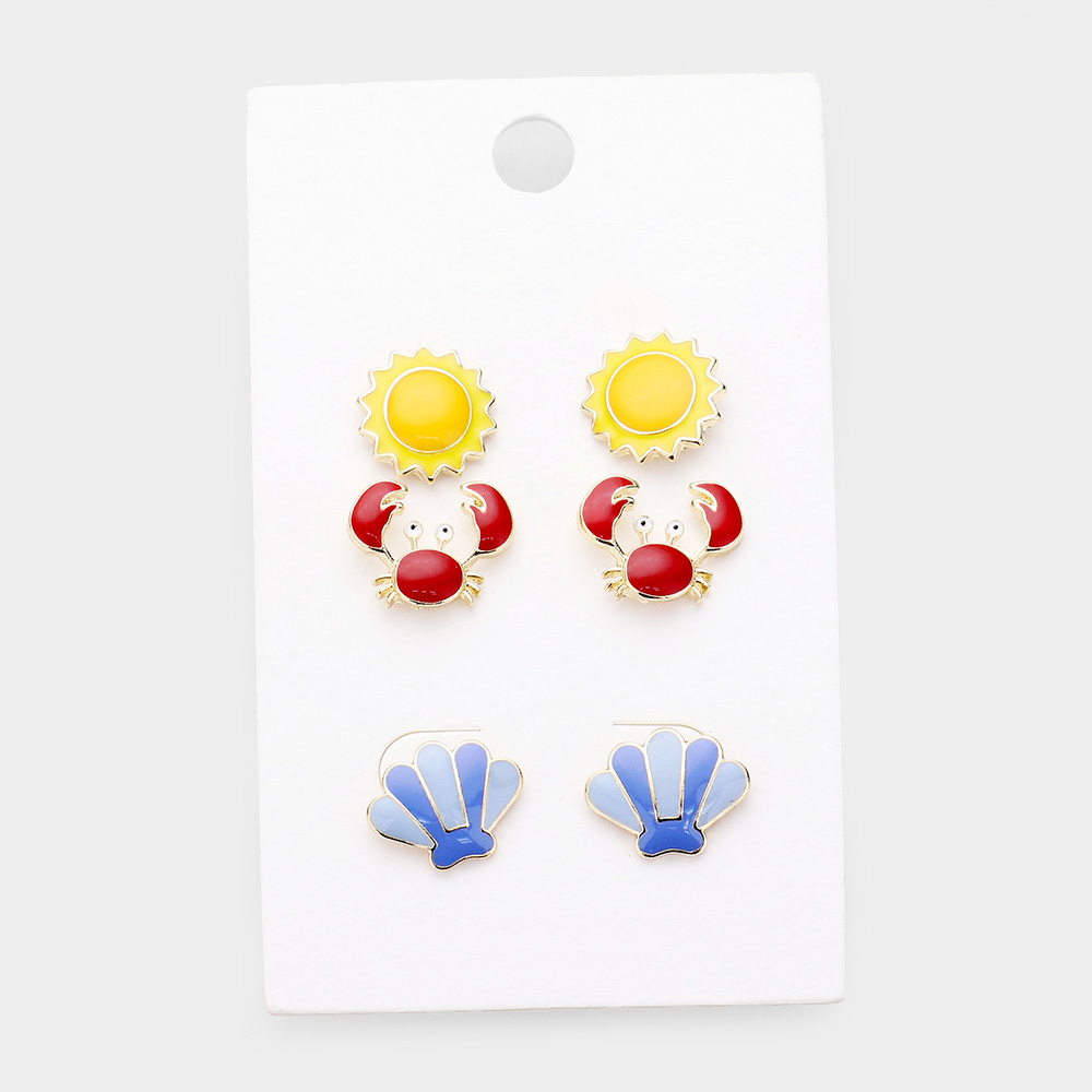 3Pairs - Enamel Sun /Crab /Shell Stud Earrings