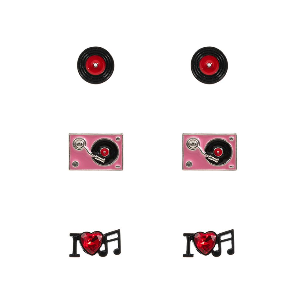 3PAIRS - Enamel Turn Table Music Stud Earring Set